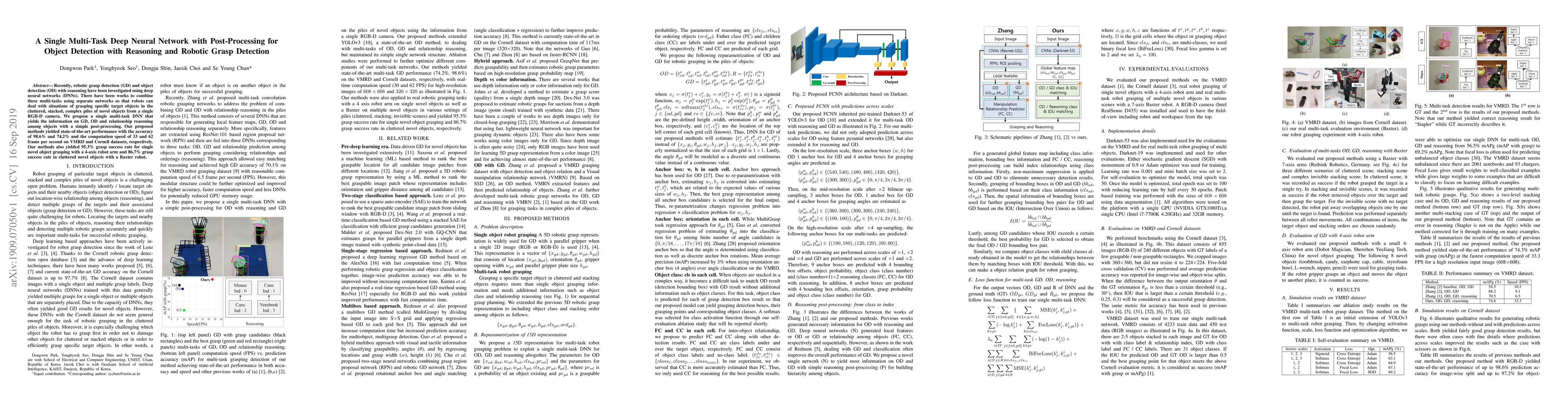 This paper proposes a single multi-task deep neural network for simultaneous object detection and robotic grasp detection, achieving state-of-the-art performance with high accuracy and speed. The method also demonstrates successful grasp execution on both single and cluttered objects.