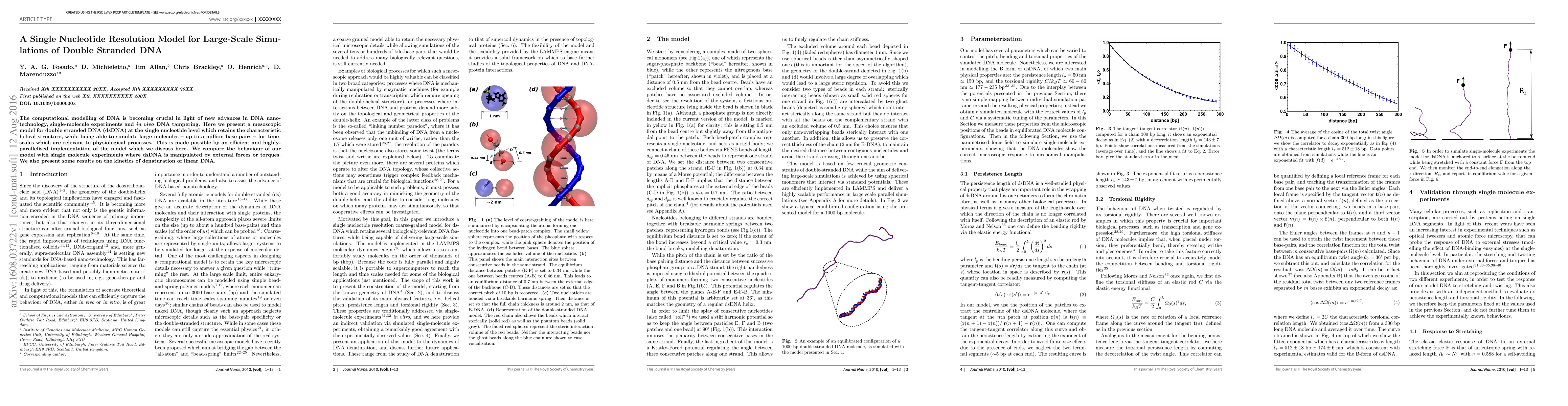 The computational modelling of DNA is becoming crucial in light of new advances in DNA nanotechnology, single-molecule experiments and in vivo DNA tampering. Here we present a mesoscopic model for double stranded DNA (dsDNA) at the single nucleotide level which retains the characteristic helical structure, while being able to simulate large molecules -- up to a million base pairs -- for time-scales which are relevant to physiological processes. This is made possible by an efficient and highly-parallelised implementation of the model which we discuss here. We compare the behaviour of our model with single molecule experiments where dsDNA is manipulated by external forces or torques. We also present some results on the kinetics of denaturation of linear DNA.