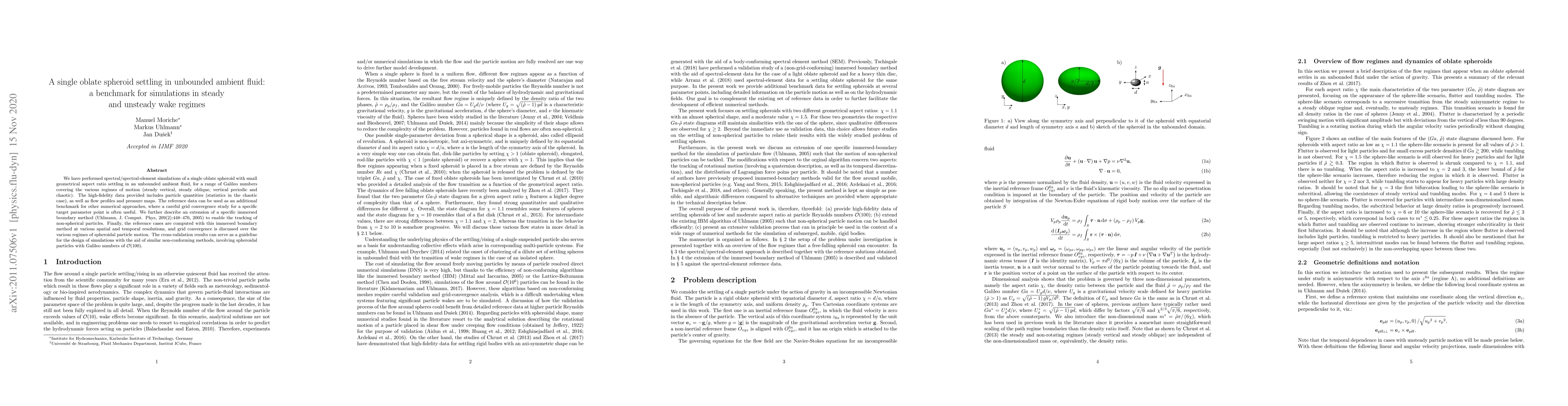 We have performed spectral/spectral-element simulations of a single oblate spheroid with small geometrical aspect ratio settling in an unbounded ambient fluid, for a range of Galileo numbers covering the various regimes of motion (steady vertical, steady oblique, vertical periodic and chaotic). The high-fidelity data provided includes particle quantities (statistics in the chaotic case), as well as flow profiles and pressure maps. The reference data can be used as an additional benchmark for other numerical approaches, where a careful grid convergence study for a specific target parameter point is often useful. We further describe an extension of a specific immersed boundary method (Uhlmann, J. Comput. Phys, 209(2):448--476, 2005) to enable the tracking of non-spherical particles. Finally, the reference cases are computed with this immersed boundary method at various spatial and temporal resolutions, and grid convergence is discussed over the various regimes of spheroidal particle motion. The cross-validation results can serve as a guideline for the design of simulations with the aid of similar non-conforming methods, involving spheroidal particles with Galileo numbers of ${\cal O}(100)$.