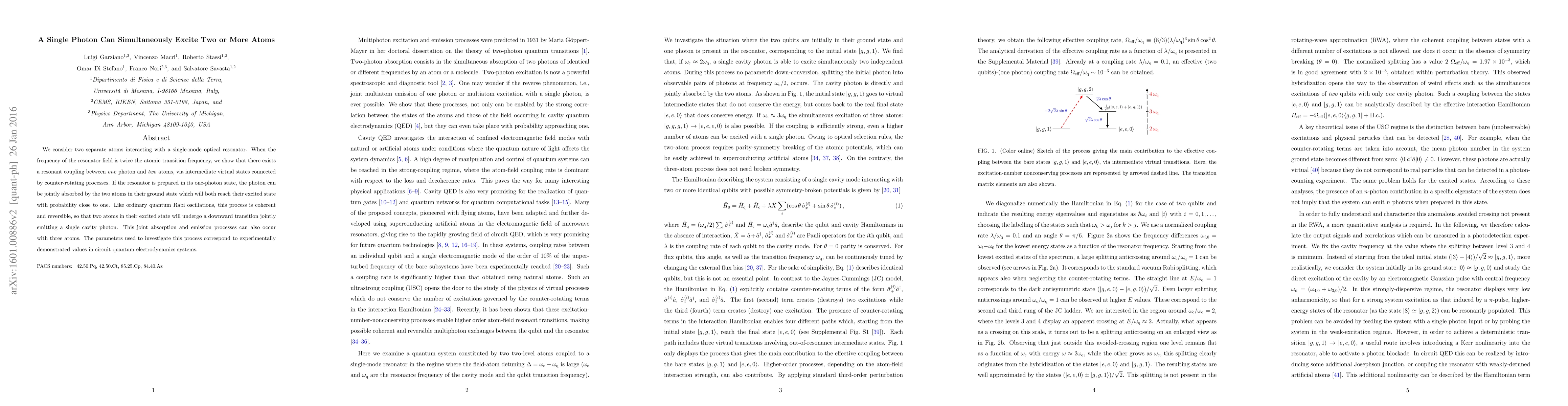 This paper explores resonant coupling between a single photon and two or more atoms within a single-mode optical resonator, demonstrating that a photon can simultaneously excite two atoms via intermediate virtual states. The process is coherent and reversible, allowing for joint absorption and emission, and is feasible with current circuit quantum electrodynamics technology.