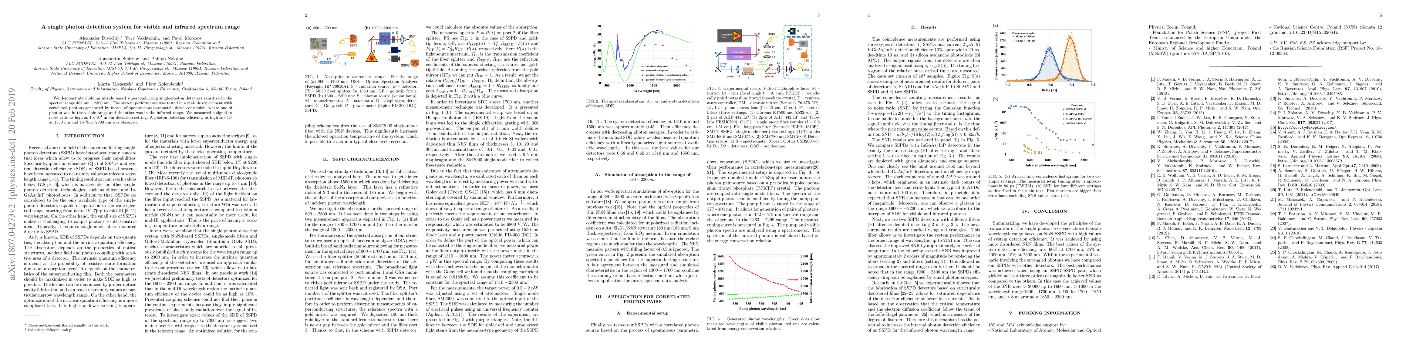 We demonstrate niobium nitride based superconducting single-photon detectors sensitive in the spectral range 452 nm - 2300 nm. The system performance was tested in a real-life experiment with correlated photons generated by means of spontaneous parametric down conversion, where one of photon was in the visible range and the other was in the infrared range. We measured a signal to noise ratio as high as $4\times 10^4$ in our detection setting. A photon detection efficiency as high as 64% at 1550 nm and 15% at 2300 nm was observed.