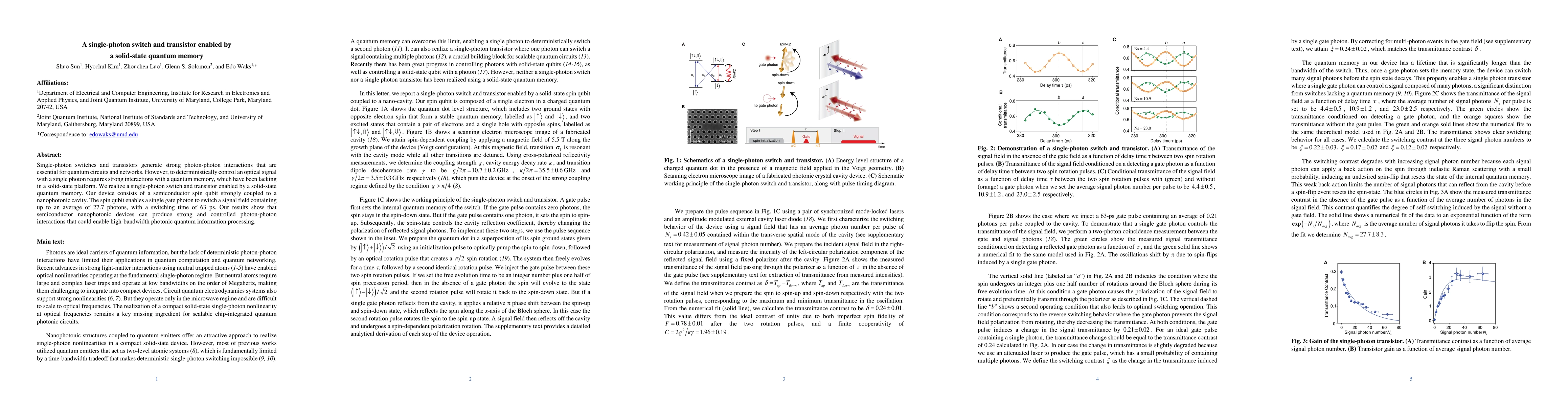 This research demonstrates a solid-state quantum memory-enabled single-photon switch and transistor that uses a semiconductor spin qubit coupled to a nanophotonic cavity, achieving controlled switching of optical signals with strong photon-photon interactions. The device operates within 63 ps and indicates potential for high-bandwidth quantum information processing.