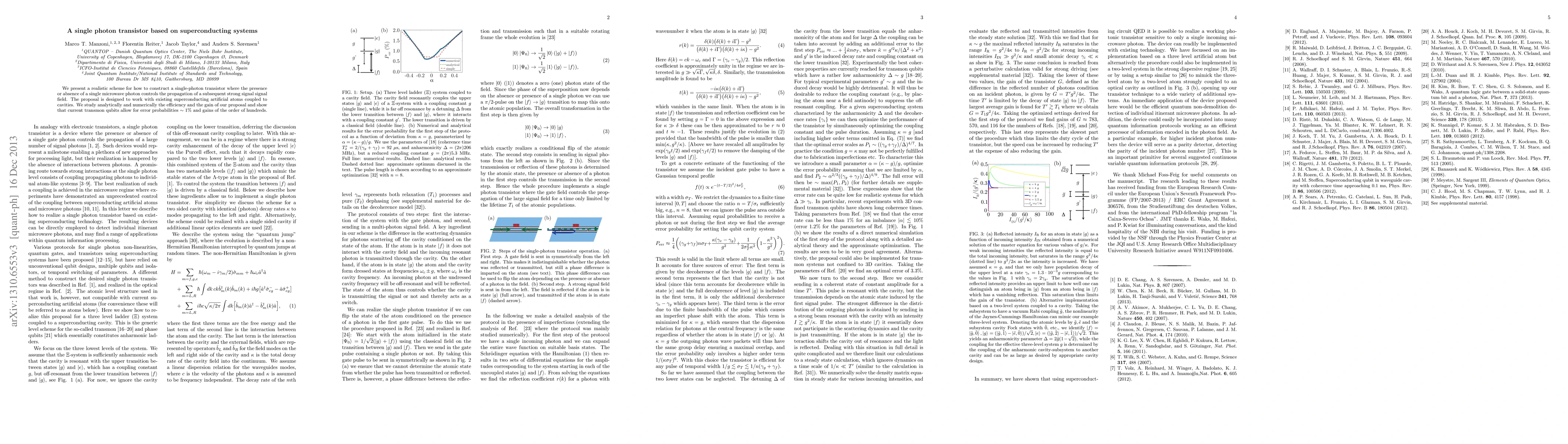This paper proposes a single-photon transistor using superconducting qubits, where a single microwave photon controls the signal field. The design achieves error rates around 1% and gains of hundreds, leveraging current transmon qubits.