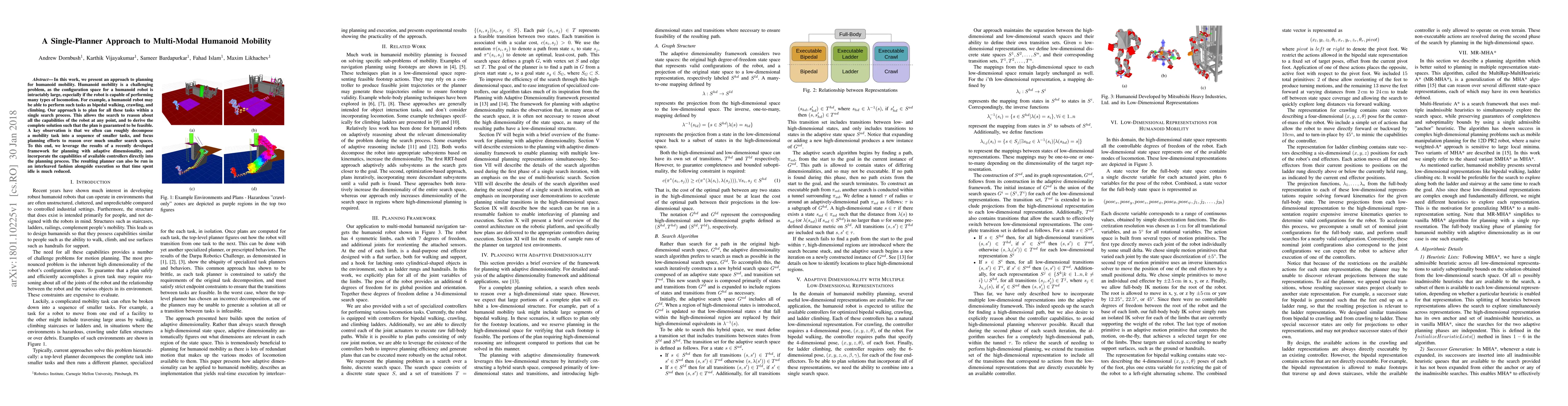 This research paper proposes a single-planner approach to plan for multi-modal humanoid mobility, allowing robots to perform various tasks like walking, crawling, and climbing within a single search process. The approach leverages adaptive dimensionality and incorporates controller capabilities into the planning process to reduce time spent idle during execution.
