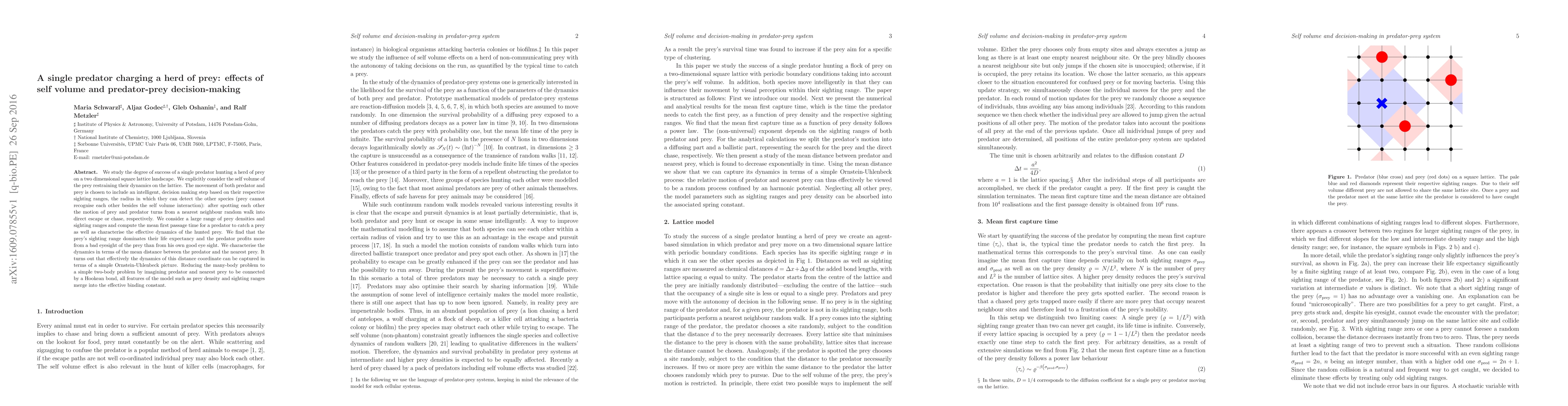 We study the degree of success of a single predator hunting a herd of prey on a two dimensional square lattice landscape. We explicitly consider the self volume of the prey restraining their dynamics on the lattice. The movement of both predator and prey is chosen to include an intelligent, decision making step based on their respective sighting ranges, the radius in which they can detect the other species (prey cannot recognise each other besides the self volume interaction): after spotting each other the motion of prey and predator turns from a nearest neighbour random walk into direct escape or chase, respectively. We consider a large range of prey densities and sighting ranges and compute the mean first passage time for a predator to catch a prey as well as characterise the effective dynamics of the hunted prey. We find that the prey's sighting range dominates their life expectancy and the predator profits more from a bad eyesight of the prey than from his own good eye sight. We characterise the dynamics in terms of the mean distance between the predator and the nearest prey. It turns out that effectively the dynamics of this distance coordinate can be captured in terms of a simple Ornstein-Uhlenbeck picture. Reducing the many-body problem to a simple two-body problem by imagining predator and nearest prey to be connected by a Hookean bond, all features of the model such as prey density and sighting ranges merge into the effective binding constant.