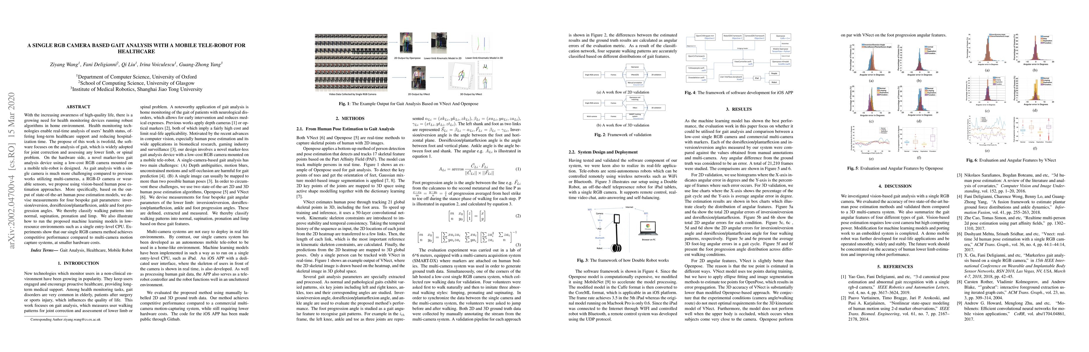 With the increasing awareness of high-quality life, there is a growing need for health monitoring devices running robust algorithms in home environment. Health monitoring technologies enable real-time analysis of users' health status, offering long-term healthcare support and reducing hospitalization time. The purpose of this work is twofold, the software focuses on the analysis of gait, which is widely adopted for joint correction and assessing any lower limb or spinal problem. On the hardware side, we design a novel marker-less gait analysis device using a low-cost RGB camera mounted on a mobile tele-robot. As gait analysis with a single camera is much more challenging compared to previous works utilizing multi-cameras, a RGB-D camera or wearable sensors, we propose using vision-based human pose estimation approaches. More specifically, based on the output of two state-of-the-art human pose estimation models (Openpose and VNect), we devise measurements for four bespoke gait parameters: inversion/eversion, dorsiflexion/plantarflexion, ankle and foot progression angles. We thereby classify walking patterns into normal, supination, pronation and limp. We also illustrate how to run the purposed machine learning models in low-resource environments such as a single entry-level CPU. Experiments show that our single RGB camera method achieves competitive performance compared to state-of-the-art methods based on depth cameras or multi-camera motion capture system, at smaller hardware costs.