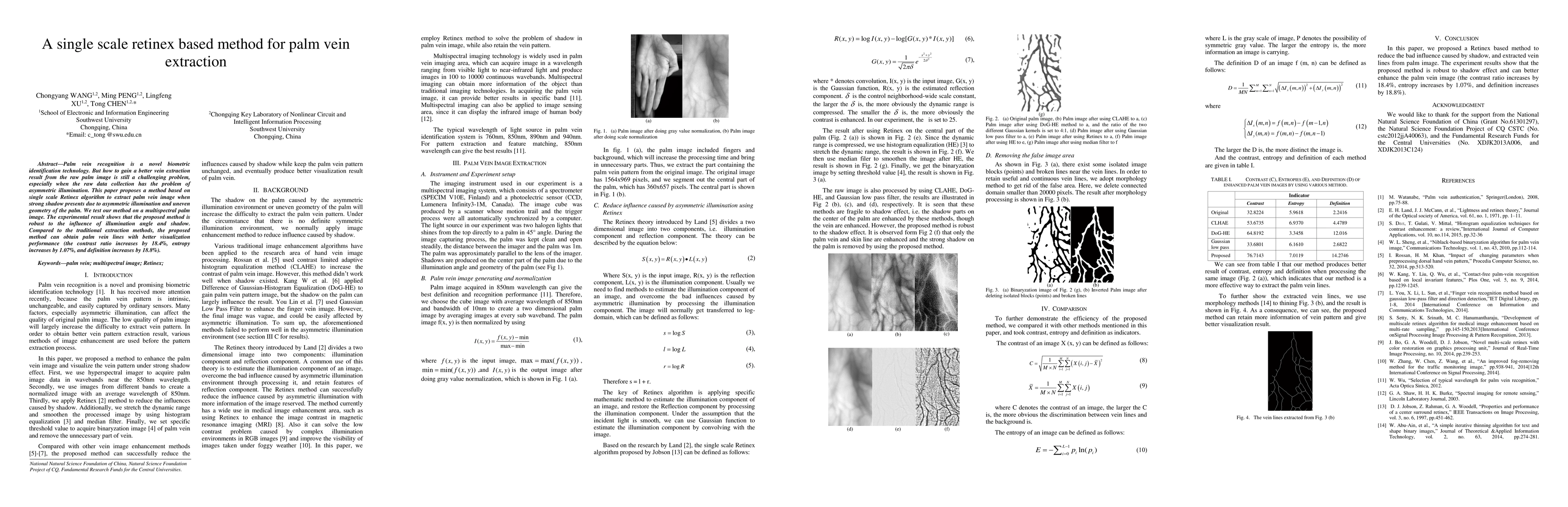 This paper proposes a single scale Retinex-based method for extracting palm vein images under asymmetric illumination and shadows, achieving better visualization performance with improved contrast, entropy, and definition compared to traditional methods. The method demonstrates robustness to varying illumination angles and shadow effects.