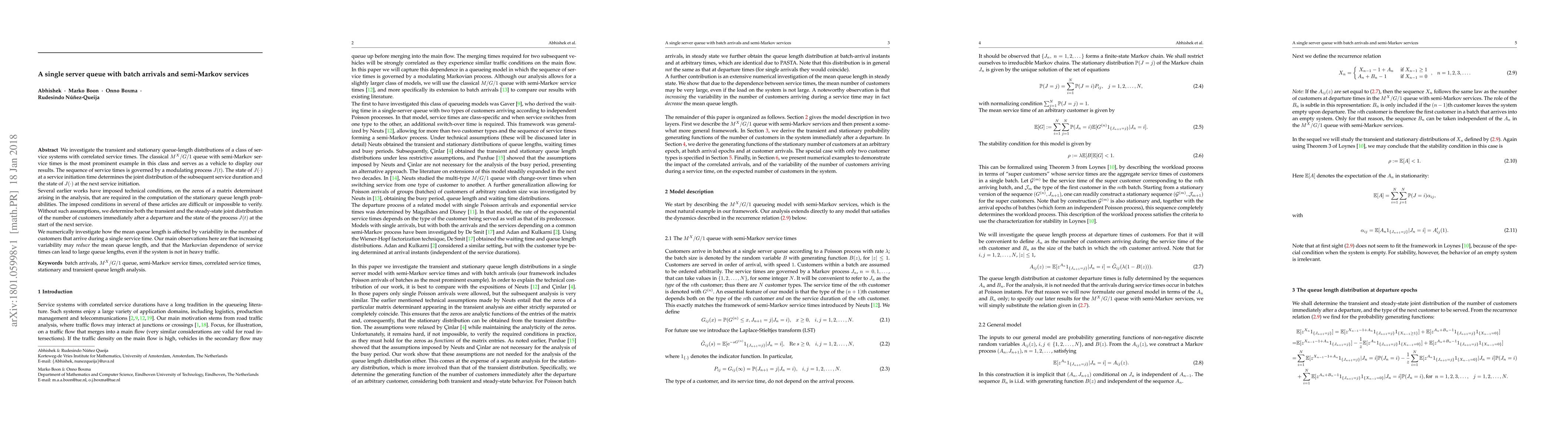 This paper studies the transient and stationary queue-length distributions in a single server queue with batch arrivals and semi-Markov services, finding that increased variability in arrivals can reduce mean queue length. The analysis avoids restrictive assumptions used in earlier works, determining the joint distribution of queue length and service state without such conditions.
