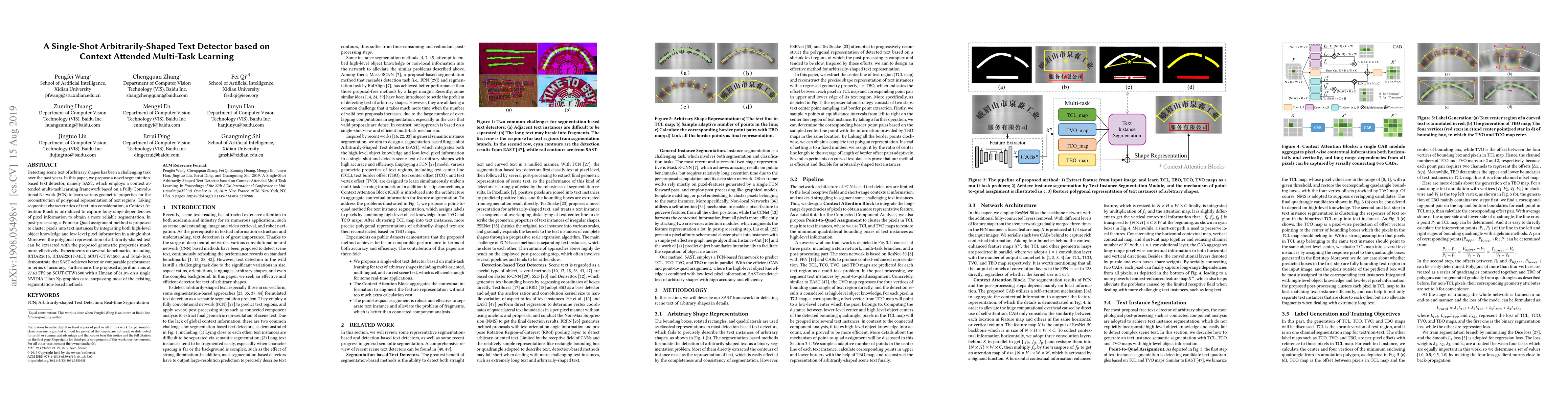 This paper proposes a novel text detector called SAST that uses context attended multi-task learning to detect arbitrary-shaped text with high accuracy, surpassing existing methods in performance and speed.