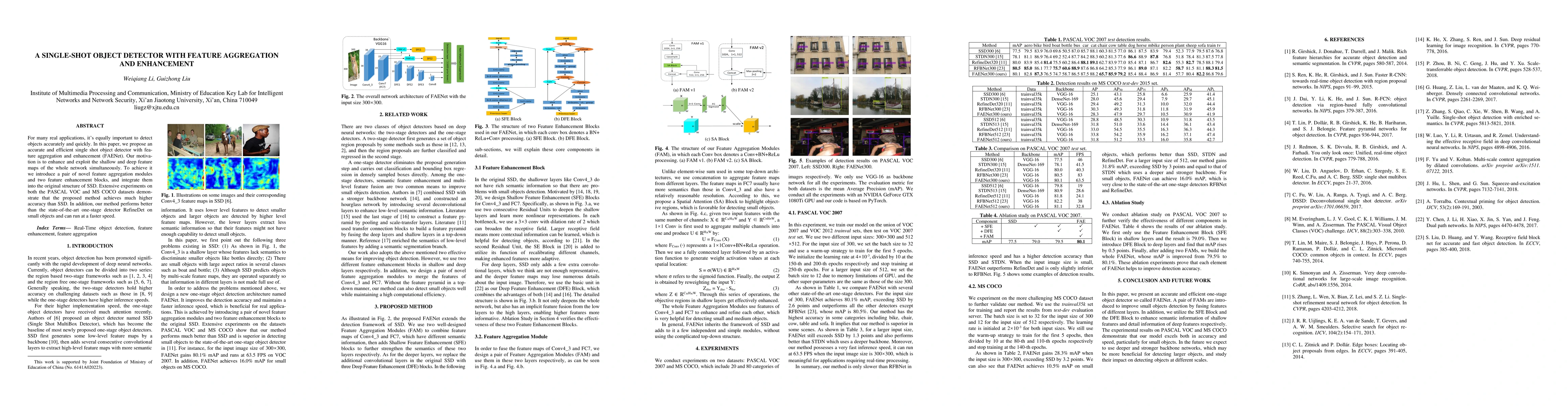For many real applications, it is equally important to detect objects accurately and quickly. In this paper, we propose an accurate and efficient single shot object detector with feature aggregation and enhancement (FAENet). Our motivation is to enhance and exploit the shallow and deep feature maps of the whole network simultaneously. To achieve it we introduce a pair of novel feature aggregation modules and two feature enhancement blocks, and integrate them into the original structure of SSD. Extensive experiments on both the PASCAL VOC and MS COCO datasets demonstrate that the proposed method achieves much higher accuracy than SSD. In addition, our method performs better than the state-of-the-art one-stage detector RefineDet on small objects and can run at a faster speed.