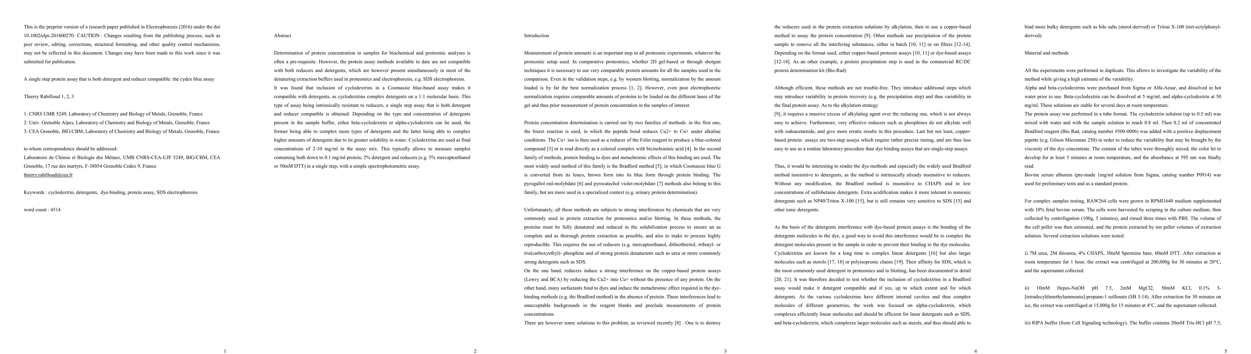 Determination of protein concentration in often an absolute pre-requisite in preparing samples for biochemical and proteomic analyses. However, current protein assay methods are not compatible with both reducers and detergents, which are however present simultaneously in most denaturing extraction buffers used in proteomics and electrophoresis, and in particular in SDS electrophoresis. We found that inclusion of cyclodextrins in a Coomassie blue-based assay made it compatible with detergents, as cyclodextrins complex detergents in a 1:1 molecular ratio. As this type of assay is intrinsically resistant to reducers, we have thus developed a single step assay that is both detergent and reducer compatible. Depending on the type and concentration of detergents present in the sample buffer, either beta-cyclodextrin or alpha-cyclodextrin can be used, the former being able to complex a wider range of detergents and the latter being able to complex higher amounts of detergents due to its greater solubility in water. Cyclodextrins are used at final concentrations of 2-10 mg/mL in the assay mix. This typically allows to measure samples containing as little as 0.1 mg/mL protein, in the presence of up to 2% detergent and reducers such as 5 % mercaptoethanol or 50 mM DTT in a single step with a simple spectrophotometric assay. This article is protected by copyright. All rights reserved.