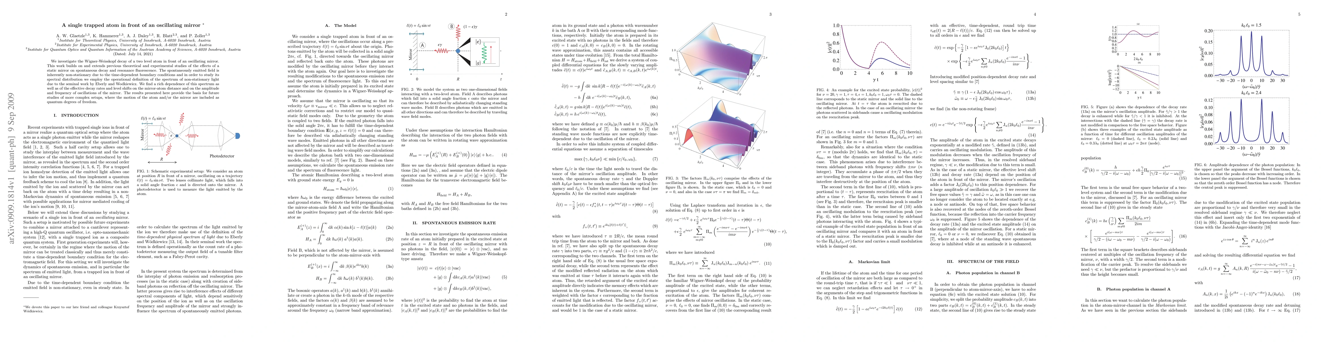 This paper explores the Wigner-Weisskopf decay of a two-level atom in front of an oscillating mirror, revealing a complex dependence on mirror oscillations and atom-mirror distance, which informs future studies of quantum dynamics in more intricate setups.