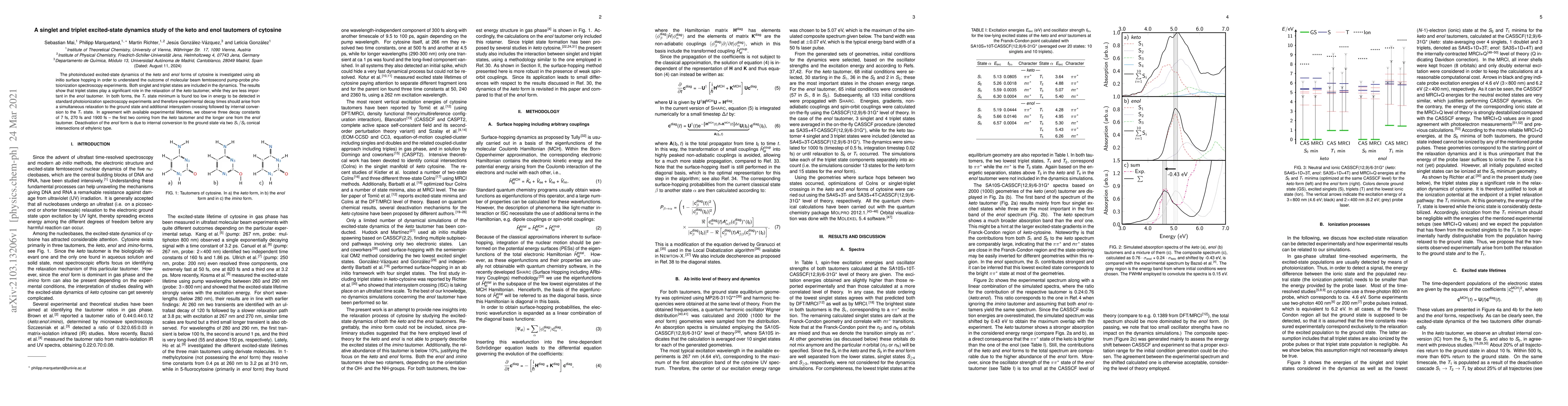 The photoinduced excited-state dynamics of the keto and enol forms of cytosine is investigated using ab initio surface hopping in order to understand the outcome of molecular beam femtosecond pump-probe photoionization spectroscopy experiments. Both singlet and triplet states are included in the dynamics. The results show that triplet states play a significant role in the relaxation of the keto tautomer, while they are less important in the enol tautomer. In both forms, the T$_1$ state minimum is found too low in energy to be detected in standard photoionization spectroscopy experiments and therefore experimental decay times should arise from a simultaneous relaxation to the ground state and additional intersystem crossing followed by internal conversion to the T$_1$ state. In agreement with available experimental lifetimes, we observe three decay constants of 7 fs, 270 fs and 1900 fs - the first two coming from the keto tautomer and the longer one from the enol tautomer. Deactivation of the enol form is due to internal conversion to the ground state via two S$_1$/S$_0$ conical intersections of ethylenic type.