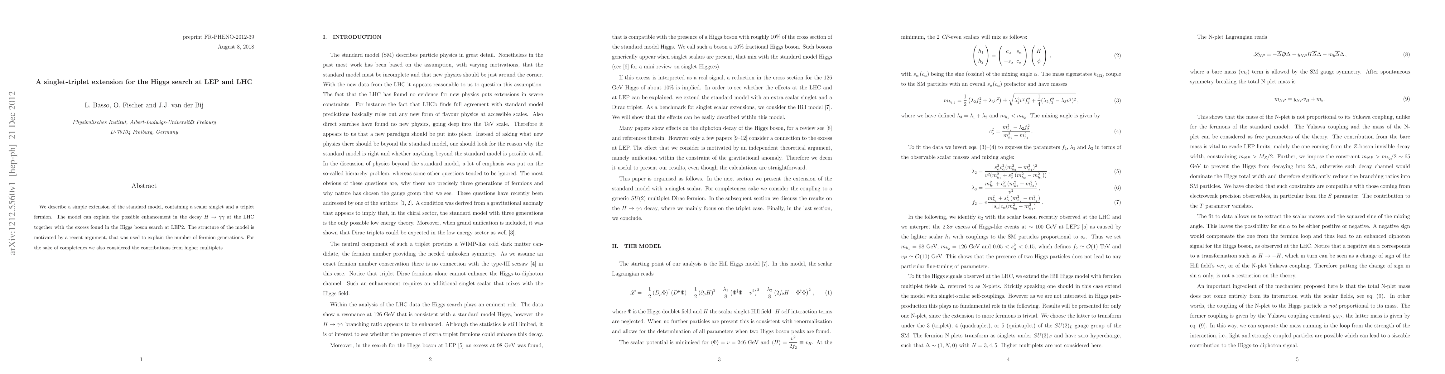 We describe a simple extension of the standard model, containing a scalar singlet and a triplet fermion. The model can explain the possible enhancement in the decay $H \rightarrow \gamma \gamma$ at the LHC together with the excess found in the Higgs boson search at LEP2. The structure of the model is motivated by a recent argument, that was used to explain the number of fermion generations. For the sake of completenes we also considered the contributions from higher multiplets.