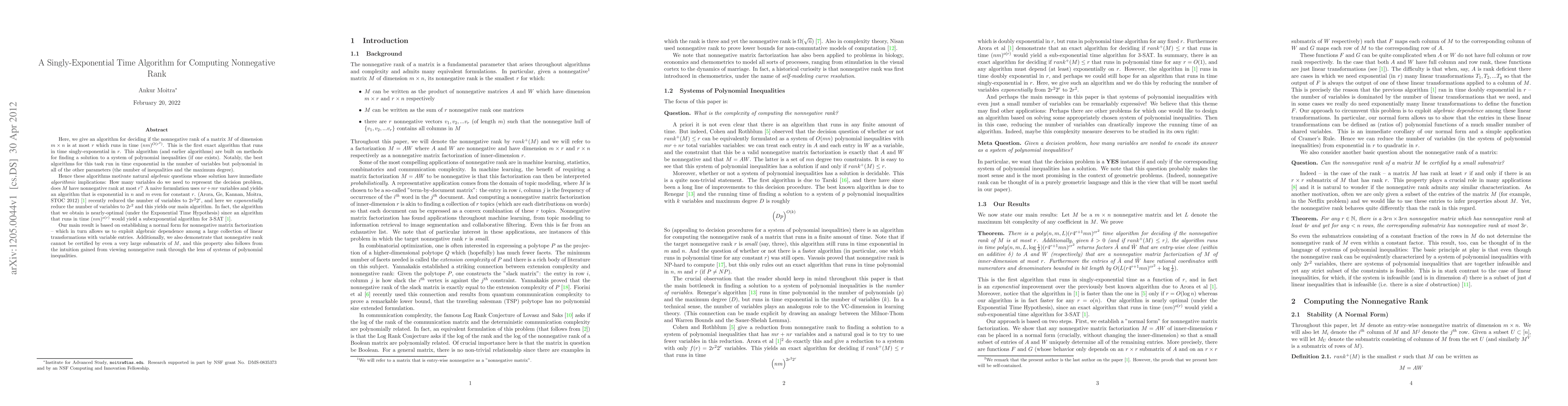 Here, we give an algorithm for deciding if the nonnegative rank of a matrix $M$ of dimension $m \times n$ is at most $r$ which runs in time $(nm)^{O(r^2)}$. This is the first exact algorithm that runs in time singly-exponential in $r$. This algorithm (and earlier algorithms) are built on methods for finding a solution to a system of polynomial inequalities (if one exists). Notably, the best algorithms for this task run in time exponential in the number of variables but polynomial in all of the other parameters (the number of inequalities and the maximum degree). Hence these algorithms motivate natural algebraic questions whose solution have immediate {\em algorithmic} implications: How many variables do we need to represent the decision problem, does $M$ have nonnegative rank at most $r$? A naive formulation uses $nr + mr$ variables and yields an algorithm that is exponential in $n$ and $m$ even for constant $r$. (Arora, Ge, Kannan, Moitra, STOC 2012) recently reduced the number of variables to $2r^2 2^r$, and here we exponentially reduce the number of variables to $2r^2$ and this yields our main algorithm. In fact, the algorithm that we obtain is nearly-optimal (under the Exponential Time Hypothesis) since an algorithm that runs in time $(nm)^{o(r)}$ would yield a subexponential algorithm for 3-SAT . Our main result is based on establishing a normal form for nonnegative matrix factorization - which in turn allows us to exploit algebraic dependence among a large collection of linear transformations with variable entries. Additionally, we also demonstrate that nonnegative rank cannot be certified by even a very large submatrix of $M$, and this property also follows from the intuition gained from viewing nonnegative rank through the lens of systems of polynomial inequalities.