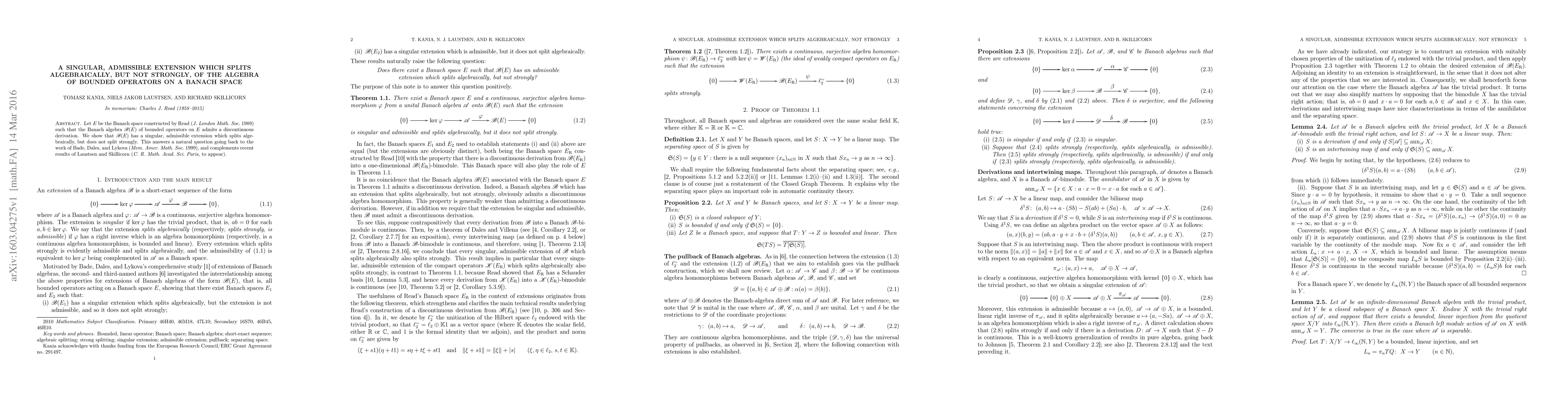A Banach space $E$ constructed by Read has an algebra of bounded operators $igr(igr(Eigr)igr)$ with a singular, admissible extension that splits algebraically but not strongly, answering a long-standing question in the field.