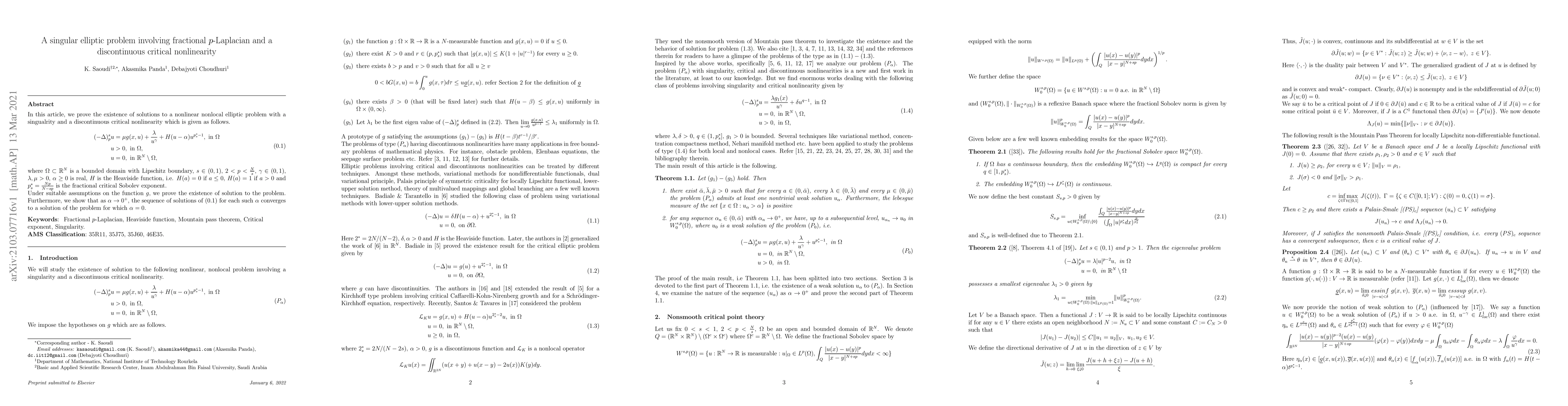 In this article, we prove the existence of solutions to a nonlinear nonlocal elliptic problem with a singualrity and a discontinuous critical nonlinearity which is given as follows. \begin{align} \begin{split}\label{main_prob} (-\Delta)_p^su&=\mu g(x,u)+\frac{\lambda}{u^\gamma}+H(u-\alpha)u^{p_s^*-1},~\text{in}~\Omega u&>0,~\text{in}~\Omega, u&=0,~\text{in}~\mathbb{R}^N\setminus\Omega, \end{split} \end{align} where $\Omega\subset\mathbb{R}^N$ is a bounded domain with Lipschitz boundary, $s\in (0,1)$, $2