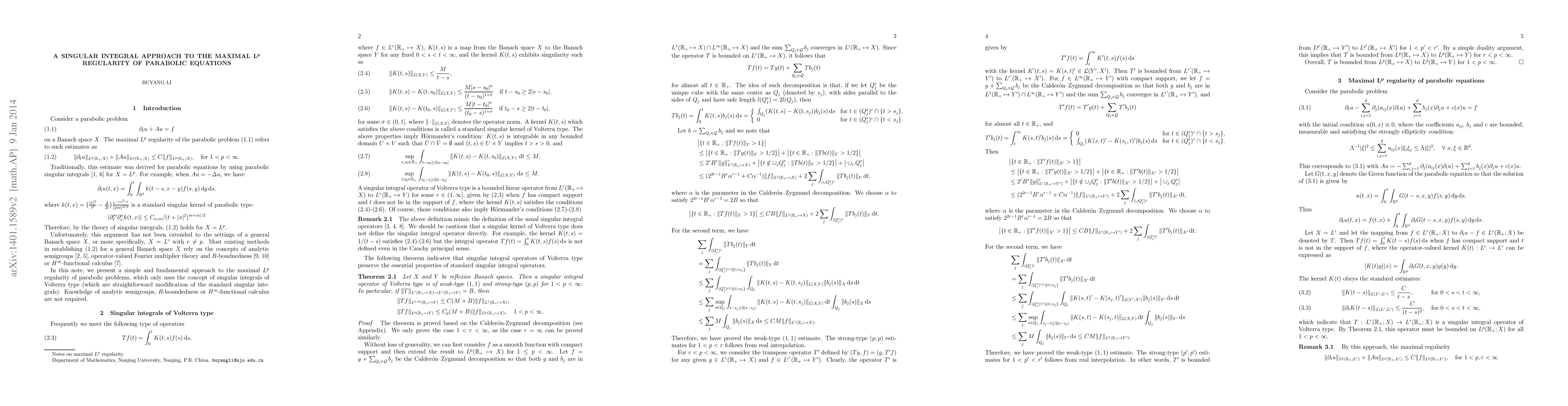 Summary: This paper presents a singular integral approach to achieving maximal L^p regularity for parabolic equations, relying solely on Volterra type singular integrals without requiring advanced knowledge of analytic semigroups or functional calculus.
