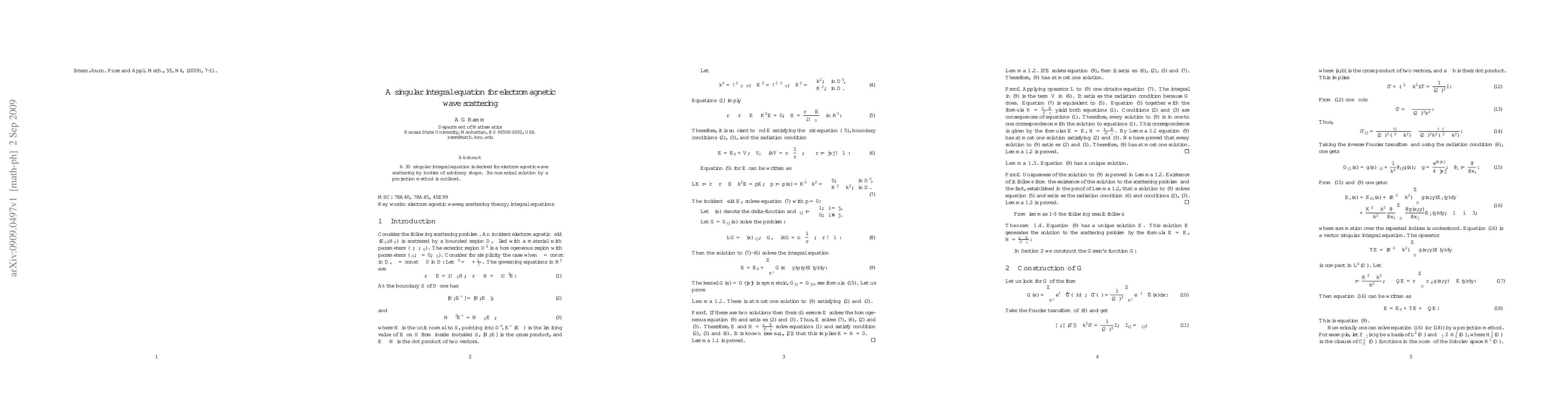 A 3D singular integral equation is derived for electromagnetic wave scattering by bodies of arbitrary shape. Its numerical solution by a projection method is outlined.