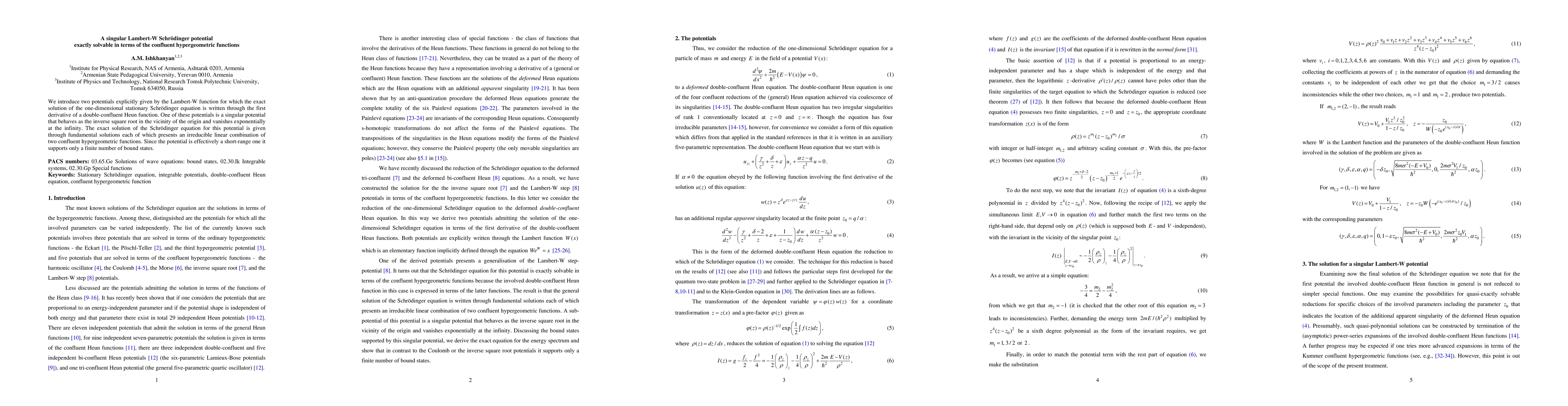 We introduce two potentials explicitly given by the Lambert-W function for which the exact solution of the one-dimensional stationary Schr\"odinger equation is written through the first derivative of a double-confluent Heun function. One of these potentials is a singular potential that behaves as the inverse square root in the vicinity of the origin and vanishes exponentially at the infinity. The exact solution of the Schr\"odinger equation for this potential is given through fundamental solutions each of which presents an irreducible linear combination of two confluent hypergeometric functions. Since the potential is effectively a short-range one it supports only a finite number of bound states.