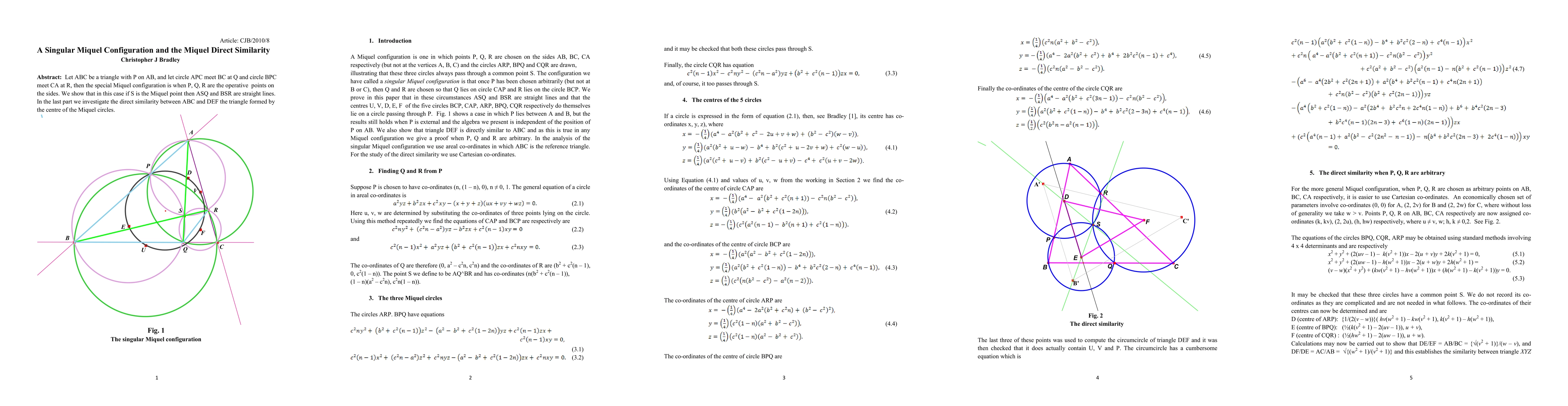 This paper explores a special Miquel configuration where points P, Q, and R form a direct similarity, proving that lines ASQ and BSR are straight. It further investigates the direct similarity between triangle ABC and triangle DEF formed by the centers of the Miquel circles.