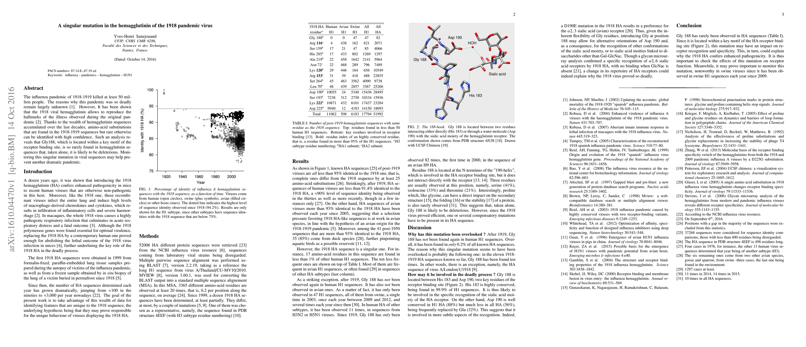 The influenza pandemic of 1918-1919 killed at least 50 million people. The reasons why this pandemic was so deadly remain largely unknown. However, It has been shown that the 1918 viral hemagglutinin allows to reproduce the hallmarks of the illness observed during the original pandemic. Thanks to the wealth of hemagglutinin sequences accumulated over the last decades, amino-acid substitutions that are found in the 1918-1919 sequences but rare otherwise can be identified with high confidence. Such an analysis reveals that Gly188, which is located within a key motif of the receptor binding site, is so rarely found in hemagglutinin sequences that, taken alone, it is likely to be deleterious. Monitoring this singular mutation in viral sequences may help prevent another dramatic pandemic.
