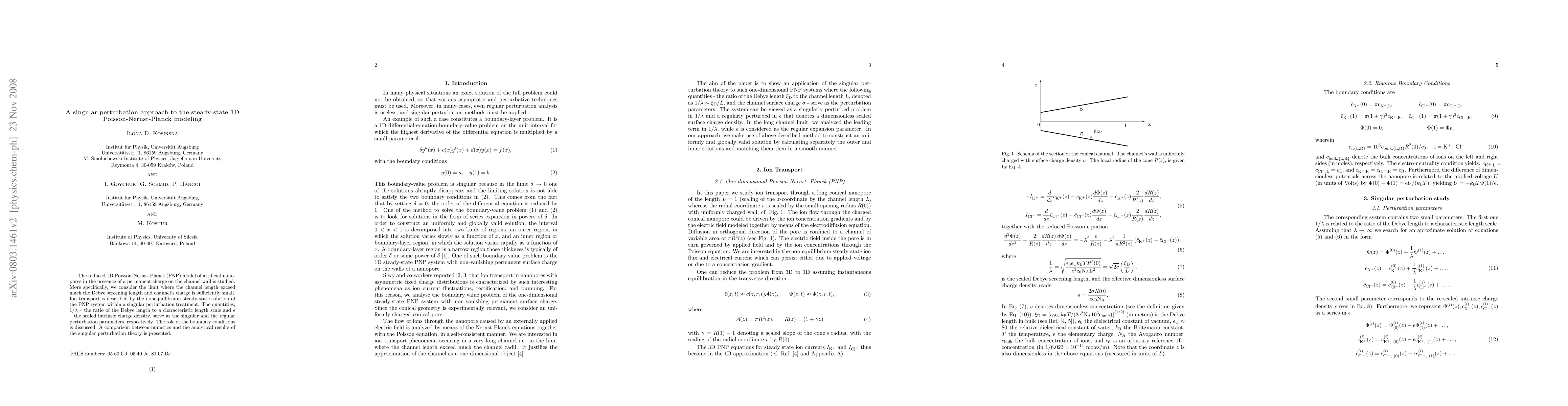 The reduced 1D Poisson-Nernst-Planck (PNP) model of artificial nanopores in the presence of a permanent charge on the channel wall is studied. More specifically, we consider the limit where the channel length exceed much the Debye screening length and channel's charge is sufficiently small. Ion transport is described by the nonequillibrium steady-state solution of the PNP system within a singular perturbation treatment. The quantities, 1/lambda -- the ratio of the Debye length to a characteristic length scale and epsilon -- the scaled intrinsic charge density, serve as the singular and the regular perturbation parameters, respectively. The role of the boundary conditions is discussed. A comparison between numerics and the analytical results of the singular perturbation theory is presented.