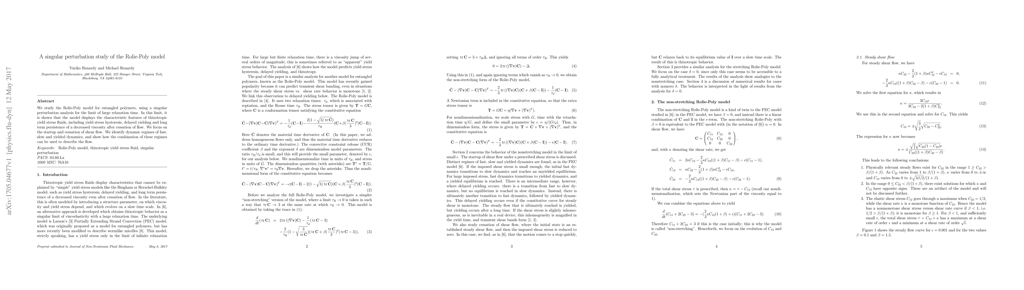 This paper employs singular perturbation analysis to investigate the Rolie-Poly model for entangled polymers, revealing thixotropic behavior with yield stress hysteresis and long-term viscosity changes under large relaxation times. It identifies distinct dynamic regimes to describe the startup and cessation of shear flow.