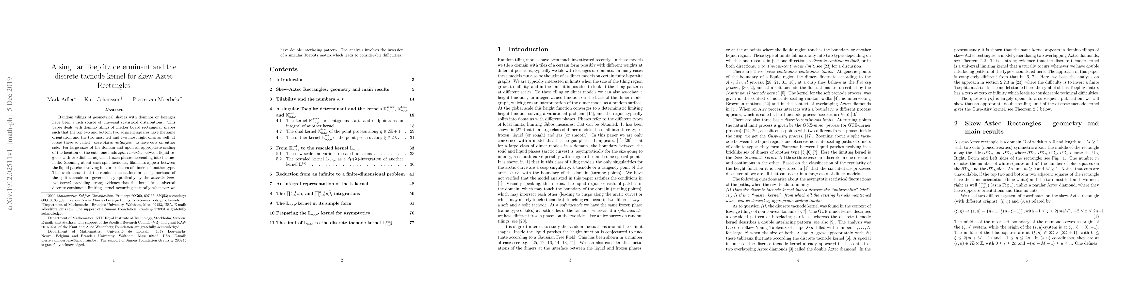 Random tilings of geometrical shapes with dominos or lozenges have been a rich source of universal statistical distributions. This paper deals with domino tilings of checker board rectangular shapes such that the top two and bottom two adjacent squares have the same orientation and the two most left and two most right ones as well. It forces these so-called "skew-Aztec rectangles" to have cuts on either side. For large sizes of the domain and upon an appropriate scaling of the location of the cuts, one finds split tacnodes between liquid regions with two distinct adjacent frozen phases descending into the tacnode. Zooming about such split tacnodes, filaments appear between the liquid patches evolving in a bricklike sea of dimers of another type. This work shows that the random fluctuations in a neighborhood of the split tacnode are governed asymptotically by the discrete tacnode kernel, providing strong evidence that this kernel is a universal discrete-continuous limiting kernel occurring naturally whenever we have double interlacing patterns. The analysis involves the inversion of a singular Toeplitz matrix which leads to considerable difficulties.