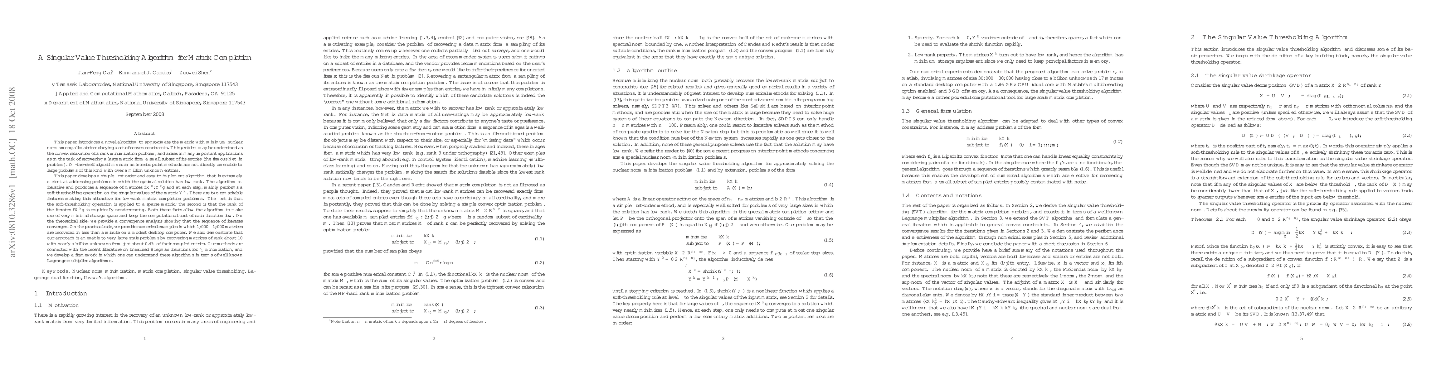 This paper proposes a novel singular value thresholding algorithm for efficiently solving low-rank matrix completion problems, demonstrating its effectiveness in recovering large matrices from sparse entries with minimal computational cost and storage. The algorithm iteratively performs soft-thresholding on singular values, showing scalability to large-scale problems.