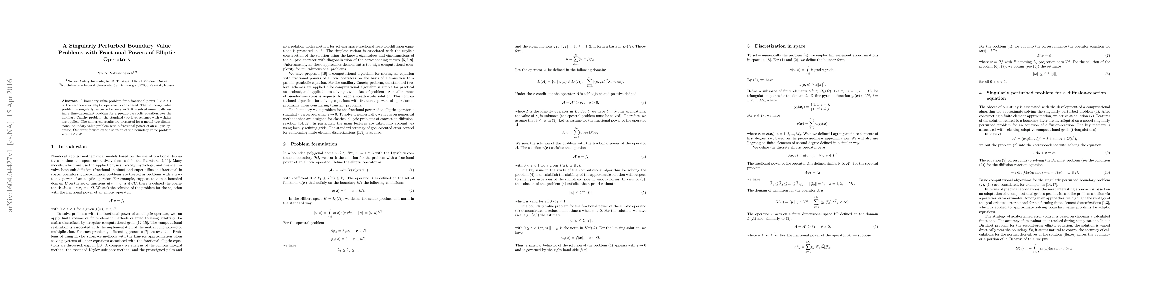 A boundary value problem for a fractional power $0 < \varepsilon < 1$ of the second-order elliptic operator is considered. The boundary value problem is singularly perturbed when $\varepsilon \rightarrow 0$. It is solved numerically using a time-dependent problem for a pseudo-parabolic equation. For the auxiliary Cauchy problem, the standard two-level schemes with weights are applied. The numerical results are presented for a model two-dimen\-sional boundary value problem with a fractional power of an elliptic operator. Our work focuses on the solution of the boundary value problem with $0 < \varepsilon \ll 1$.