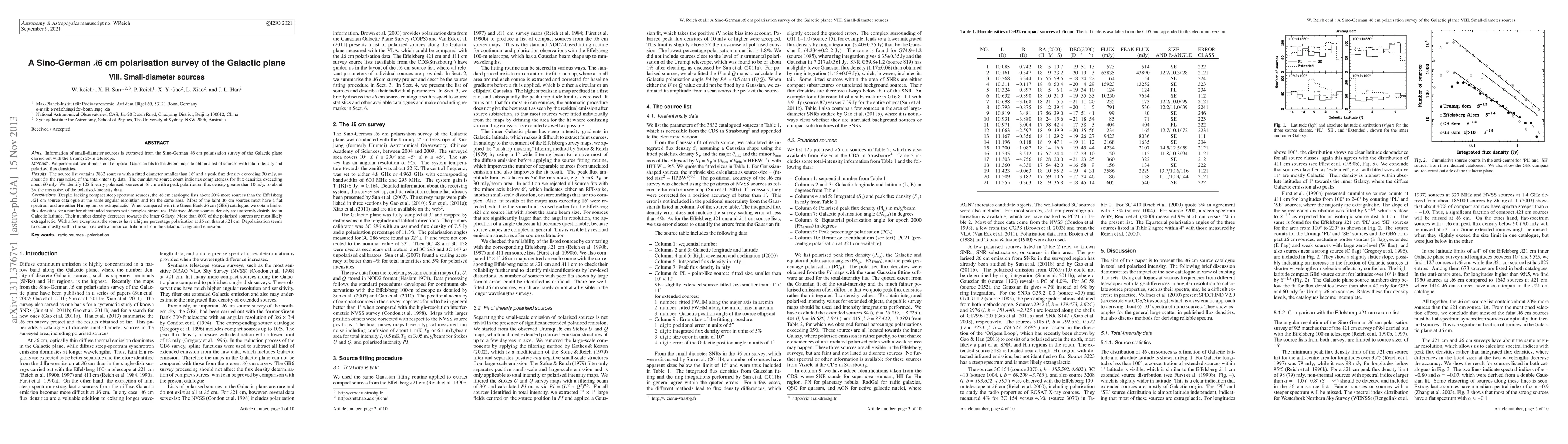 Information of small-diameter sources is extracted from the Sino-German 6cm polarisation survey of the Galactic plane carried out with the Urumqi 25-m telescope. We performed two-dimensional elliptical Gaussian fits to the 6cm maps to obtain a list of sources with total-intensity and polarised flux densities. The source list contains 3832 sources with a fitted diameter smaller than 16 arcmin and a peak flux density exceeding 30 mJy, so about 5 times the rms noise, of the total-intensity data. The cumulative source count indicates completeness for flux densities exceeding about 60 mJy. We identify 125 linearly polarised sources at 6cm with a peak polarisation flux density greater than 10 mJy, so about 3 times the rms noise, of the polarised-intensity data. Despite lacking compact steep spectrum sources, the 6cm catalogue lists about 20 percent more sources than the Effelsberg 21cm source catalogue at the same angular resolution and for the same area. Most of the faint 6cm sources must have a flat spectrum and are either HII regions or extragalactic. When compared with the Green Bank 6cm (GB6) catalogue, we obtain higher flux densities for a number of extended sources with complex structures. Polarised 6cm sources density are uniformly distributed in Galactic latitude. Their number density decreases towards the inner Galaxy. More than 80 percent of the polarised sources are most likely extragalactic. With a few exceptions, the sources have a higher percentage polarisation at 6cm than at 21cm. Depolarisation seems to occur mostly within the sources with a minor contribution from the Galactic foreground emission.
