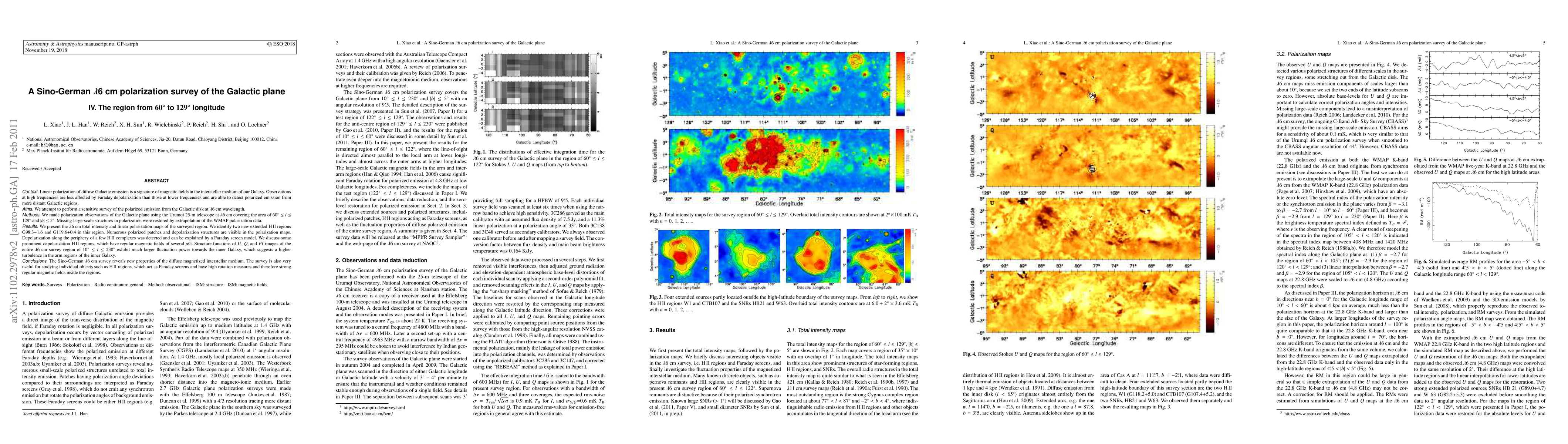 Linear polarization of diffuse Galactic emission is a signature of magnetic fields in the interstellar medium of our Galaxy. Observations at high frequencies are less affected by Faraday depolarization than those at lower frequencies and are able to detect polarized emission from more distant Galactic regions. We attempt to perform a sensitive survey of the polarized emission from the Galactic disk at 6 cm wavelength. We made polarization observations of the Galactic plane using the Urumqi 25-m telescope at 6 cm covering the area of 60deg< l <129deg and |b|<5deg. Missing large-scale structures in polarization were restored by extrapolation of the WMAP polarization data. We present the 6cm total intensity and linear polarization maps of the surveyed region. We identify two new extended HII regions G98.3-1.6 and G119.6+0.4 in this region. Numerous polarized patches and depolarization structures are visible in the polarization maps. Depolarization along the periphery of a few HII complexes was detected and can be explained by a Faraday screen model. We discuss some prominent depolarization HII regions, which have regular magnetic fields of several $\mu$G. Structure functions of U, Q and PI images of the entire 6cm survey region of 10deg< l < 230deg exhibit much larger fluctuation power towards the inner Galaxy, which suggests a higher turbulence in the arm regions of the inner Galaxy. The Sino-German 6cm survey reveals new properties of the diffuse magnetized interstellar medium. The survey is also very useful for studying individual objects such as HII regions, which act as Faraday screens and have high rotation measures and therefore strong regular magnetic fields inside the regions.