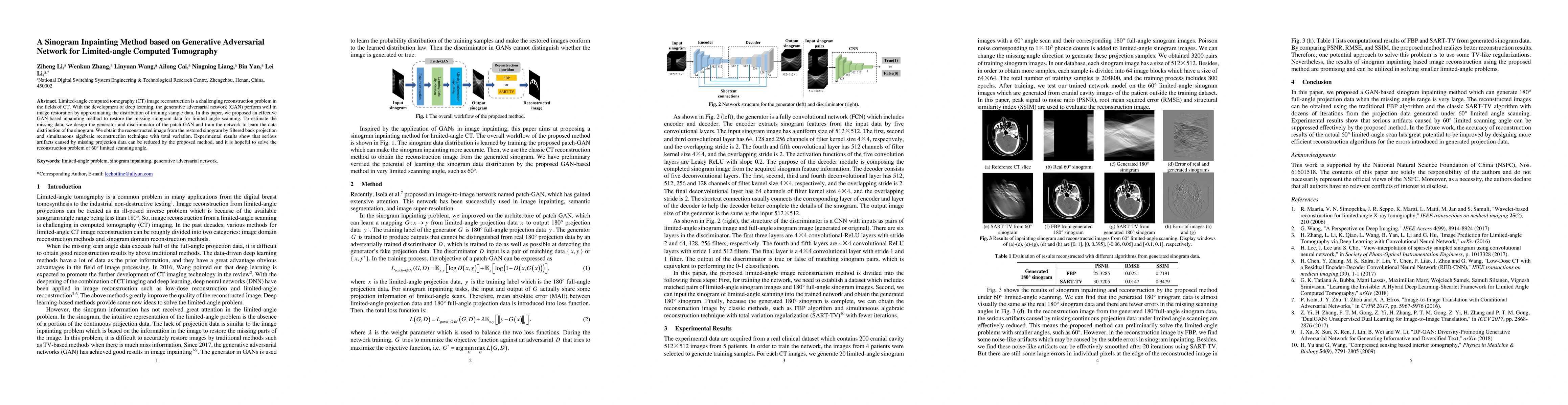This paper proposes a GAN-based inpainting method to restore missing sinogram data for limited-angle CT scans, reducing artifacts and improving reconstruction. The method uses a patch-GAN to learn the sinogram data distribution, followed by filtered back projection and simultaneous algebraic reconstruction technique.