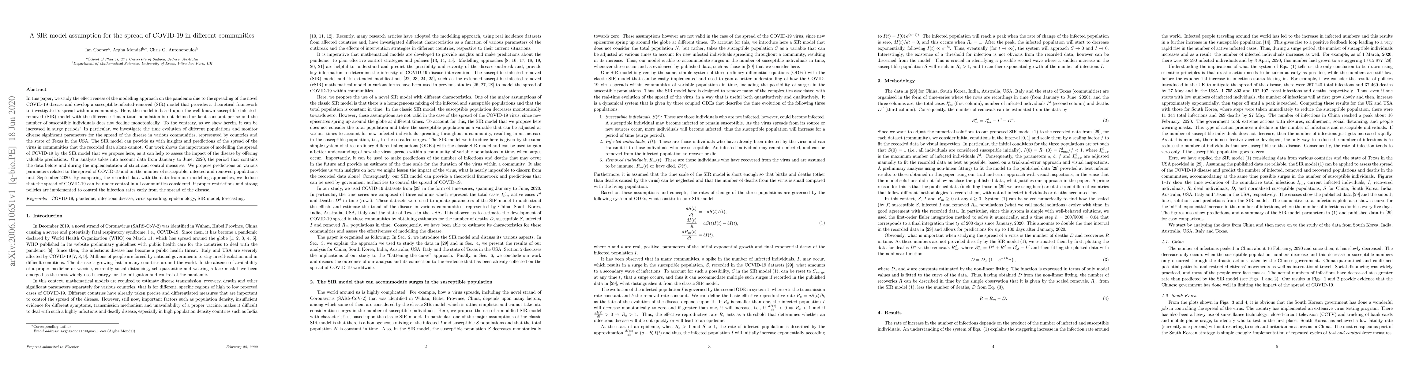 In this paper, we study the effectiveness of the modelling approach on the pandemic due to the spreading of the novel COVID-19 disease and develop a susceptible-infected-removed (SIR) model that provides a theoretical framework to investigate its spread within a community. Here, the model is based upon the well-known susceptible-infected-removed (SIR) model with the difference that a total population is not defined or kept constant per se and the number of susceptible individuals does not decline monotonically. To the contrary, as we show herein, it can be increased in surge periods! In particular, we investigate the time evolution of different populations and monitor diverse significant parameters for the spread of the disease in various communities, represented by countries and the state of Texas in the USA. The SIR model can provide us with insights and predictions of the spread of the virus in communities that the recorded data alone cannot. Our work shows the importance of modelling the spread of COVID-19 by the SIR model that we propose here, as it can help to assess the impact of the disease by offering valuable predictions. Our analysis takes into account data from January to June, 2020, the period that contains the data before and during the implementation of strict and control measures. We propose predictions on various parameters related to the spread of COVID-19 and on the number of susceptible, infected and removed populations until September 2020. By comparing the recorded data with the data from our modelling approaches, we deduce that the spread of COVID-19 can be under control in all communities considered, if proper restrictions and strong policies are implemented to control the infection rates early from the spread of the disease.