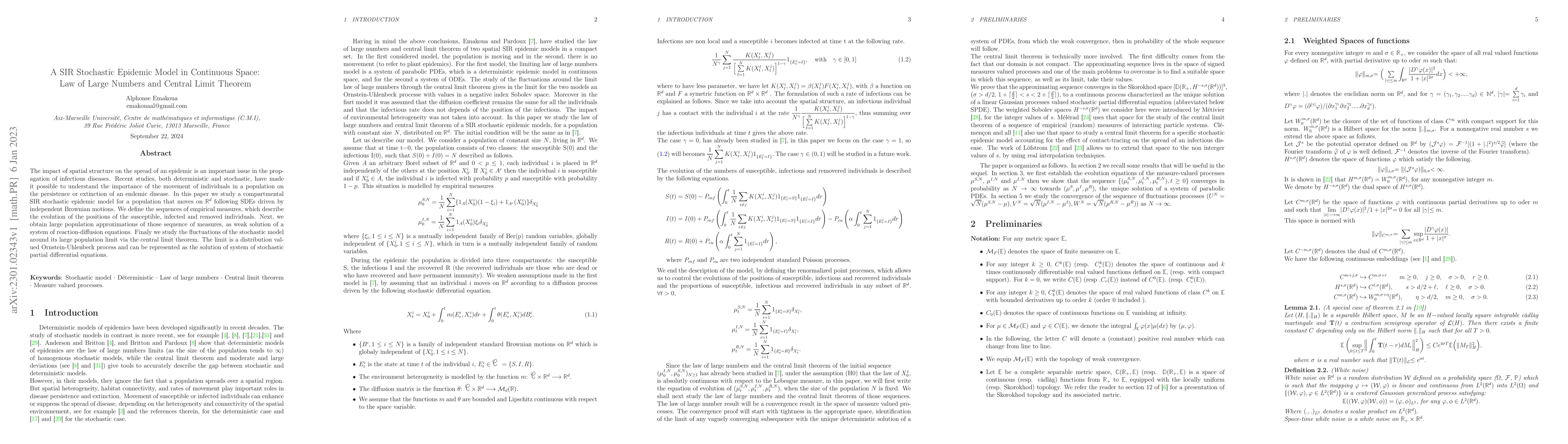 The impact of spatial structure on the spread of an epidemic is an important issue in the propagation of infectious diseases. Recent studies, both deterministic and stochastic, have made it possible to understand the importance of the movement of individuals in a population on the persistence or extinction of an endemic disease. In this paper we study a compartmental SIR stochastic epidemic model for a population that moves on $R^{d}$ following SDEs driven by independent Brownian motions. We define the sequences of empirical measures, which describe the evolution of the positions of the susceptible, infected and removed individuals. Next, we obtain large population approximations of those sequence of measures, as weak solution of a system of reaction-diffusion equations. Finaly we study the fluctuations of the stochastic model around its large population limit via the central limit theorem. The limit is a distribution valued Ornstein-Uhlenbeck process and can be represented as the solution of system of stochastic partial differential equations.