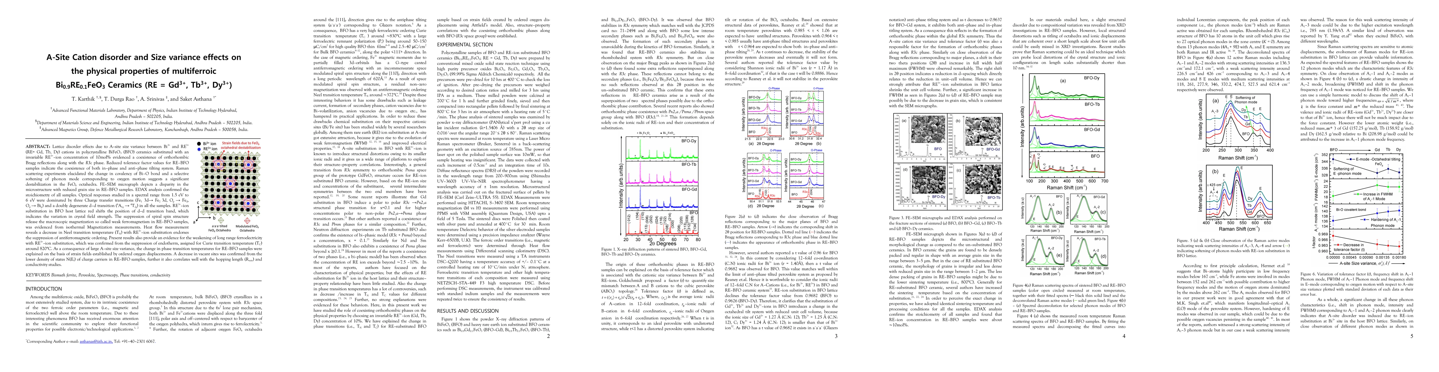 Effect of an internal chemical pressure on structural, optical, magnetic and electrical properties in Bi0.9RE0.1FeO3 Ceramics (RE =Gd3+,Tb3+,Dy3+)has been studied extensively. Some of the highlights are as follows; 1. Coexistence of orthorhombic Bragg reflections along with the R3c phase.(Structural Phase separation revealed from XRD and Raman spectroscopy) 2. Selective softening of phonon mode corresponding to oxygen motion suggests a significant destabilization in the FeO6 octahedra. 3. Three Charge transfer transitions (Fe1 3d\rightarrow Fe2 3d, Op \rightarrow Fed,Op \rightarrow Bip) and a doubly degenerate d-d transition (6A1g \rightarrow 4T2g) have been observed through optical studies. 4. The suppression of spiral spin structure release the macroscopic magnetization so called weak ferromagnetism in RE-BFO samples and expalined by presence of DM interaction 5. Heat flow measurement reveals a decrease in Neel transition temperature (TN) with RE3+-ion substitution endorses the suppression of antiferromagnetic ordering. Present results also provide an 6. A decrease in vacant sites was confirmed from the lower density of states N(Ef) of charge carriers in RE-BFO samples, further it also correlates well with the hopping length (Rmin) and conductivity studies. All the results are well correlated.