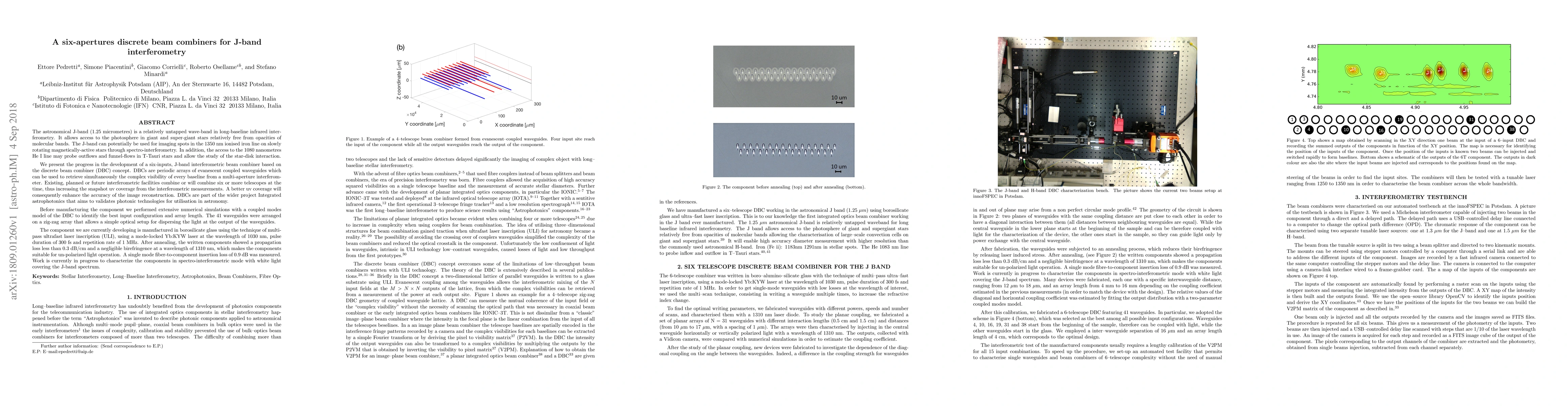 The astronomical J-band (1.25 micrometres) is a relatively untapped wave-band in long-baseline infrared interferometry. It allows access to the photosphere in giant and super-giant stars relatively free from opacities of molecular bands. The J-band can potentially be used for imaging spots in the 1350 nm ionised iron line on slowly rotating magnetically-active stars through spectro-interferometry. In addition, the access to the 1080 nanometres He I line may probe outflows and funnel-flows in T-Tauri stars and allow the study of the star-disk interaction. We present the progress in the development of a six-inputs, J-band interferometric beam combiner based on the discrete beam combiner (DBC) concept. DBCs are periodic arrays of evanescent coupled waveguides which can be used to retrieve simultaneously the complex visibility of every baseline from a multi-aperture interferometer. Existing, planned or future interferometric facilities combine or will combine six or more telescopes at the time, thus increasing the snapshot uv coverage from the interferometric measurements. A better uv coverage will consequently enhance the accuracy of the image reconstruction. The component we are currently developing is manufactured in borosilicate glass using the technique of multi-pass ultrafast laser inscription (ULI), using a mode-locked Yb:KYW laser at the wavelength of 1030 nm, pulse duration of 300 fs and repetition rate of 1 MHz. After annealing, the written components showed a propagation loss less than 0.3 dB/cm and a negligible birefringence at a wavelength of 1310 nm, which makes the components suitable for un-polarized light operation. A single mode fiber-to-component insertion loss of 0.9 dB was measured. Work is currently in progress to characterize the components in spectro-interferometric mode with white light covering the J-band spectrum.