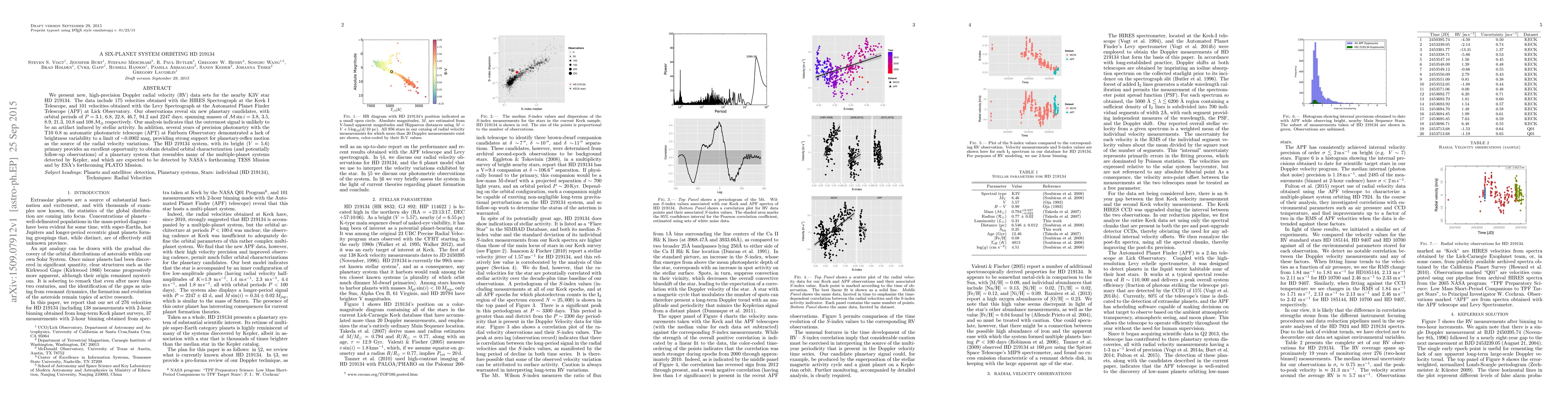 This paper reports the discovery of six new planetary candidates orbiting the K3V star HD 219134, using high-precision radial velocity data from multiple telescopes. The planets have orbital periods ranging from 3 to 2247 days and masses up to 108 Earth masses, with the outermost planet likely not an artifact of stellar activity.