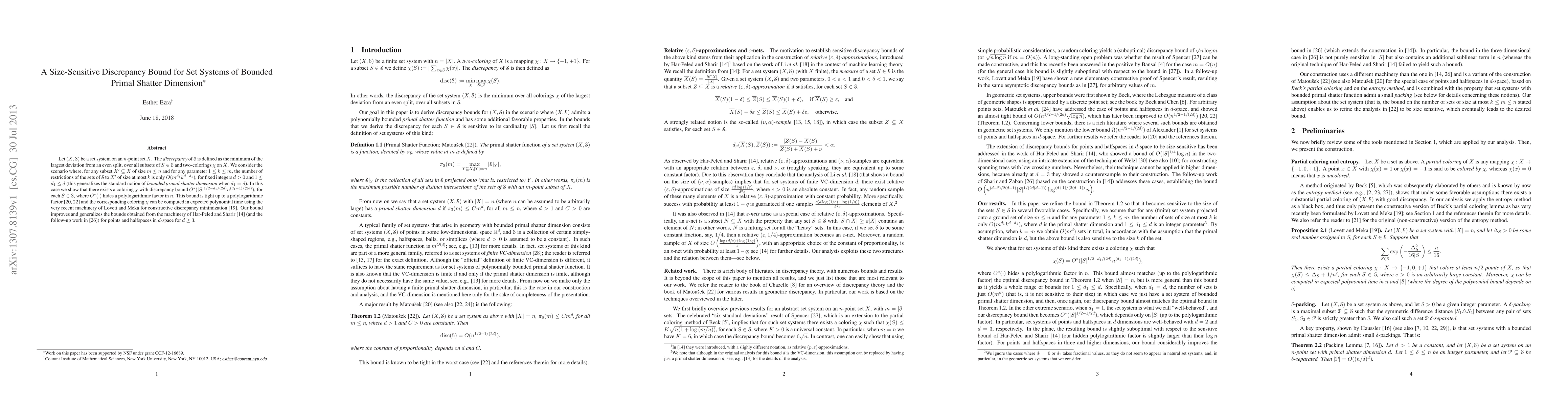 Researchers developed a size-sensitive discrepancy bound for set systems of bounded primal shatter dimension, showing that there exists a coloring with a specific optimal error bound for each subset, improving previous bounds.