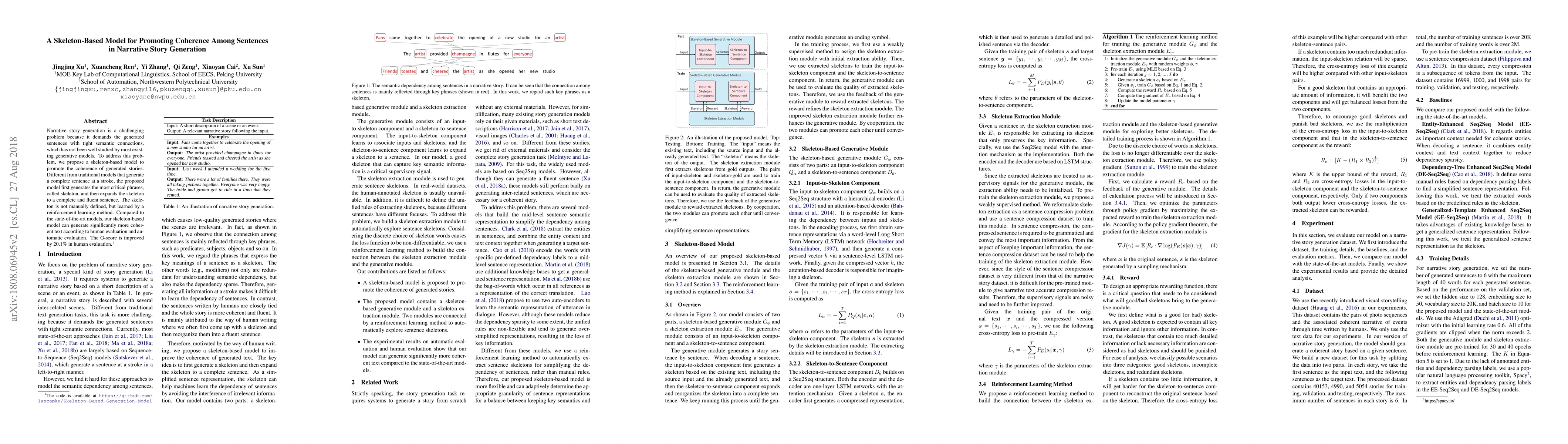 A new model for generating coherent narrative stories uses a skeleton-based approach to generate critical phrases first, then expanding them into complete sentences, outperforming existing models in human and automatic evaluation.