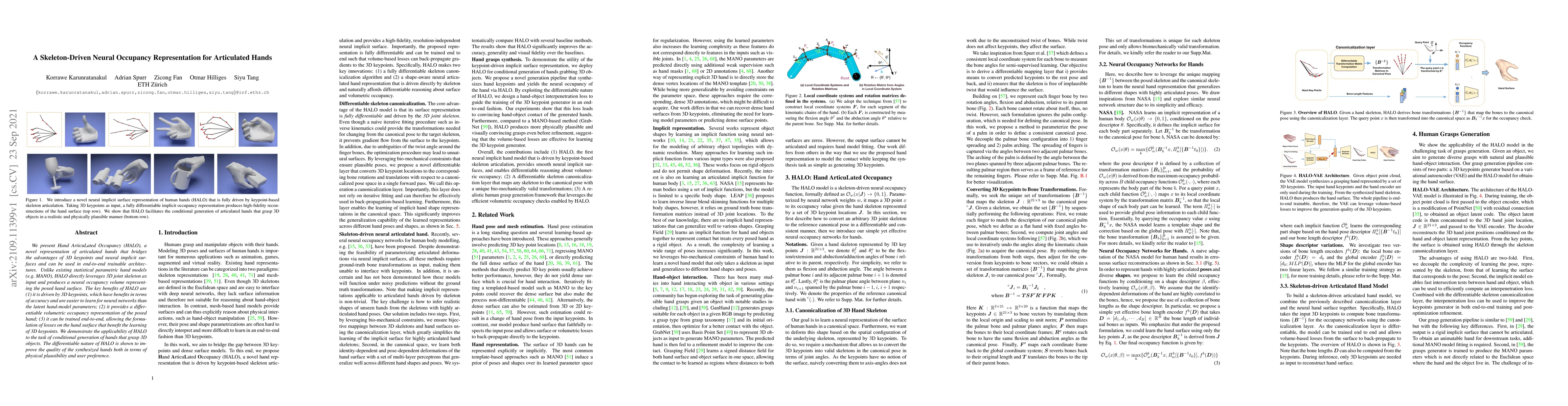 The introduction of a skeleton-driven neural occupancy representation for articulated hands, which leverages 3D keypoints and provides a differentiable volumetric occupancy representation of posed hands.