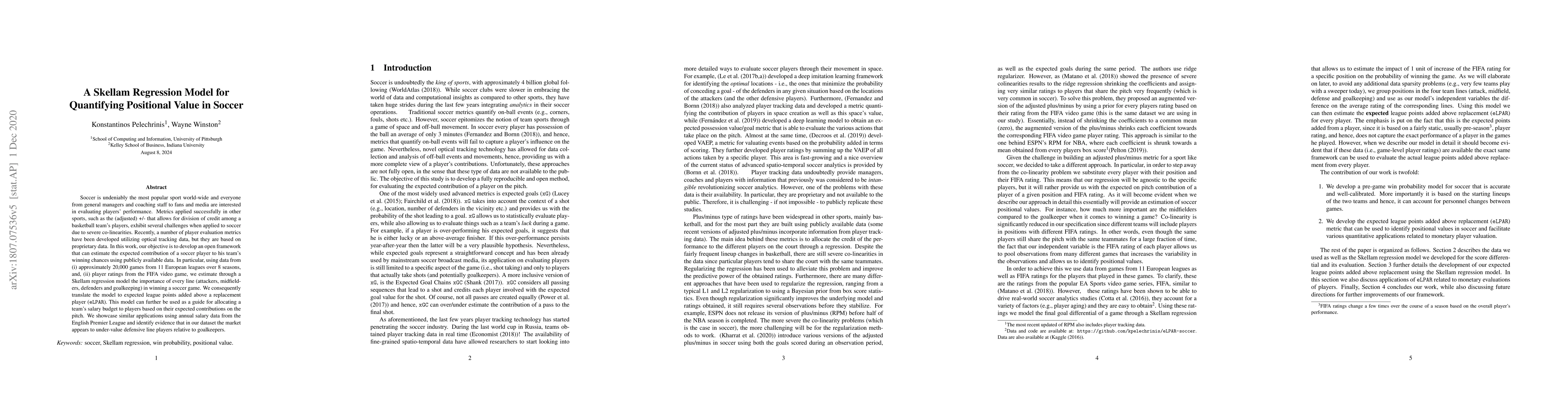 Soccer is undeniably the most popular sport world-wide and everyone from general managers and coaching staff to fans and media are interested in evaluating players' performance. Metrics applied successfully in other sports, such as the (adjusted) +/- that allows for division of credit among a basketball team's players, exhibit several challenges when applied to soccer due to severe co-linearities. Recently, a number of player evaluation metrics have been developed utilizing optical tracking data, but they are based on proprietary data. In this work, our objective is to develop an open framework that can estimate the expected contribution of a soccer player to his team's winning chances using publicly available data. In particular, using data from (i) approximately 20,000 games from 11 European leagues over 8 seasons, and, (ii) player ratings from the FIFA video game, we estimate through a Skellam regression model the importance of every line (attackers, midfielders, defenders and goalkeeping) in winning a soccer game. We consequently translate the model to expected league points added above a replacement player (eLPAR). This model can further be used as a guide for allocating a team's salary budget to players based on their expected contributions on the pitch. We showcase similar applications using annual salary data from the English Premier League and identify evidence that in our dataset the market appears to under-value defensive line players relative to goalkeepers.