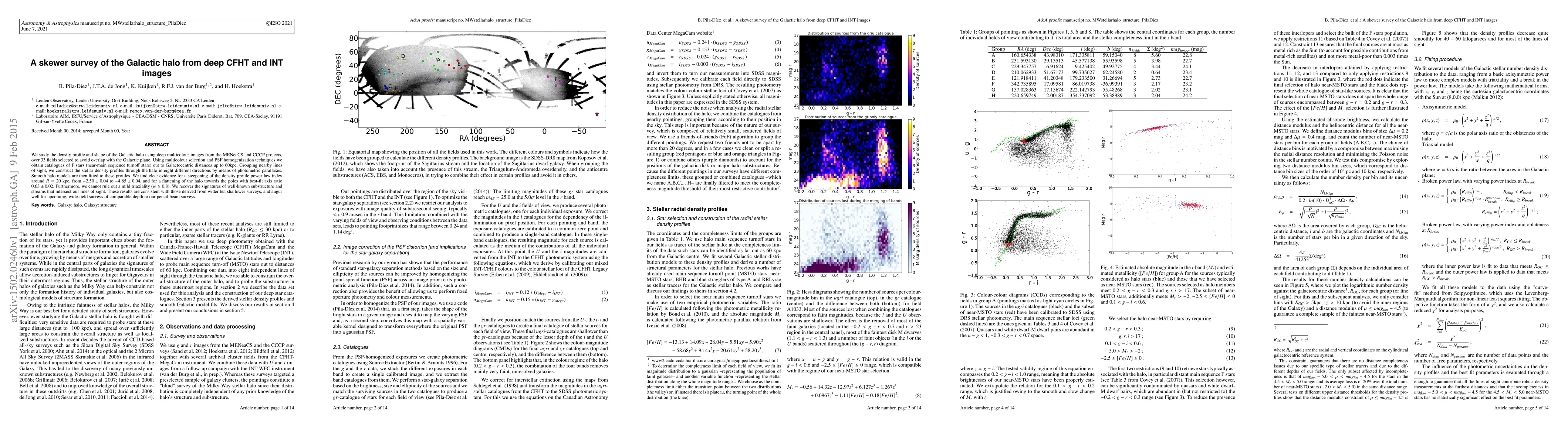 We study the density profile and shape of the Galactic halo using deep multicolour images from the MENeaCS and CCCP projects, over 33 fields selected to avoid overlap with the Galactic plane. Using multicolour selection and PSF homogenization techniques we obtain catalogues of F stars (near-main sequence turnoff stars) out to Galactocentric distances up to 60kpc. Grouping nearby lines of sight, we construct the stellar density profiles through the halo in eight different directions by means of photometric parallaxes. Smooth halo models are then fitted to these profiles. We find clear evidence for a steepening of the density profile power law index around R=20 kpc, from -2.50 +- 0.04 to -4.85 +- 0.04, and for a flattening of the halo towards the poles with best-fit axis ratio 0.63 +- 0.02. Furthermore, we cannot rule out a mild triaxiality (w>=0.8). We recover the signatures of well-known substructure and streams that intersect our lines of sight. These results are consistent with those derived from wider but shallower surveys, and augur well for upcoming, wide-field surveys of comparable depth to our pencil beam surveys.