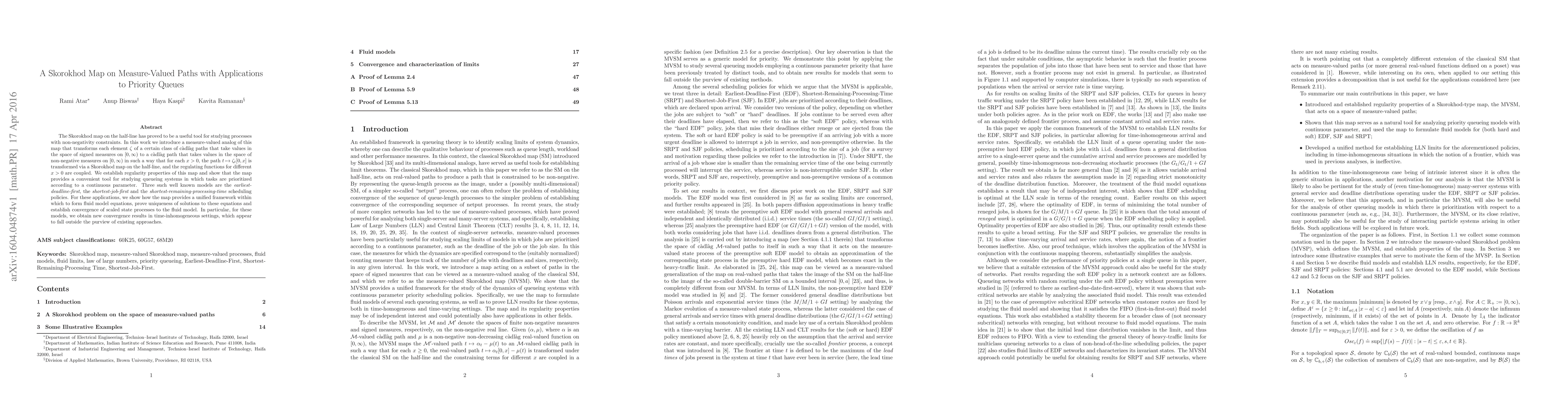 The Skorokhod map on the half-line has proved to be a useful tool for studying processes with non-negativity constraints. In this work we introduce a measure-valued analog of this map that transforms each element $\zeta$ of a certain class of c\`{a}dl\`{a}g paths that take values in the space of signed measures on the half-line to a c\`{a}dl\`{a}g path that takes values in the space of non-negative measures on $[0,\infty)$ in such a way that for each $x > 0$, the path $t \mapsto \zeta_t[0,x]$ is transformed via a Skorokhod map on the half-line, and the regulating functions for different $x > 0$ are coupled. We establish regularity properties of this map and show that the map provides a convenient tool for studying queueing systems in which tasks are prioritized according to a continuous parameter. Three such well known models are the earliest-deadline-first, the shortest-job-first and the shortest-remaining-processing-time scheduling policies. For these applications, we show how the map provides a unified framework within which to form fluid model equations, prove uniqueness of solutions to these equations and establish convergence of scaled state processes to the fluid model. In particular, for these models, we obtain new convergence results in time-inhomogeneous settings, which appear to fall outside the purview of existing approaches.