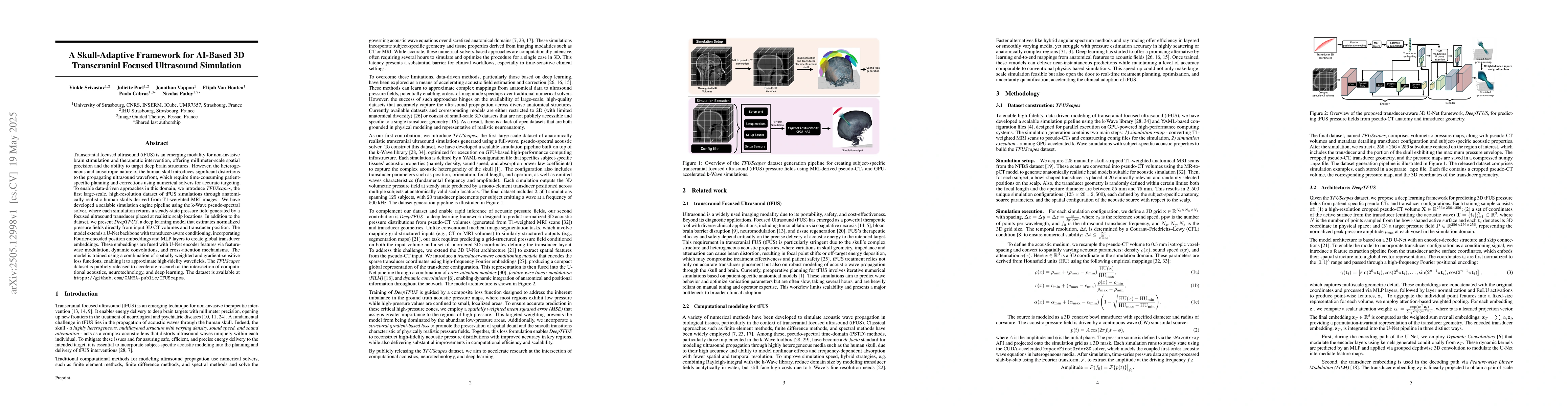 The research introduces TFUScapes, a large-scale, high-resolution dataset of tFUS simulations through anatomically realistic human skulls derived from T1-weighted MRI images. A scalable simulation engine pipeline using the k-Wave pseudo-spectral solver is developed, generating steady-state pressure fields from focused ultrasound transducers at realistic scalp locations. DeepTFUS, a deep learning model, is presented to estimate normalized pressure fields directly from 3D CT volumes and transducer position, extending a U-Net backbone with transducer-aware conditioning.