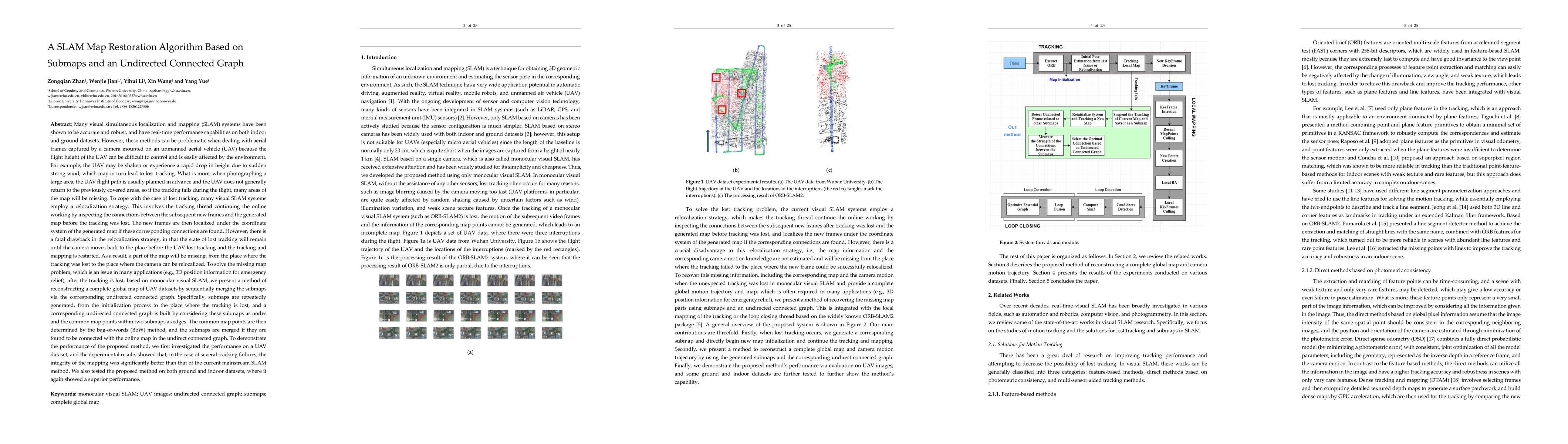 This paper presents a SLAM map restoration algorithm that reconstructs a complete global map for UAV datasets after tracking loss by merging submaps through an undirected connected graph. The method uses submaps and common map points determined via the bag-of-words method, showing improved map integrity compared to mainstream SLAM methods in UAV experiments.