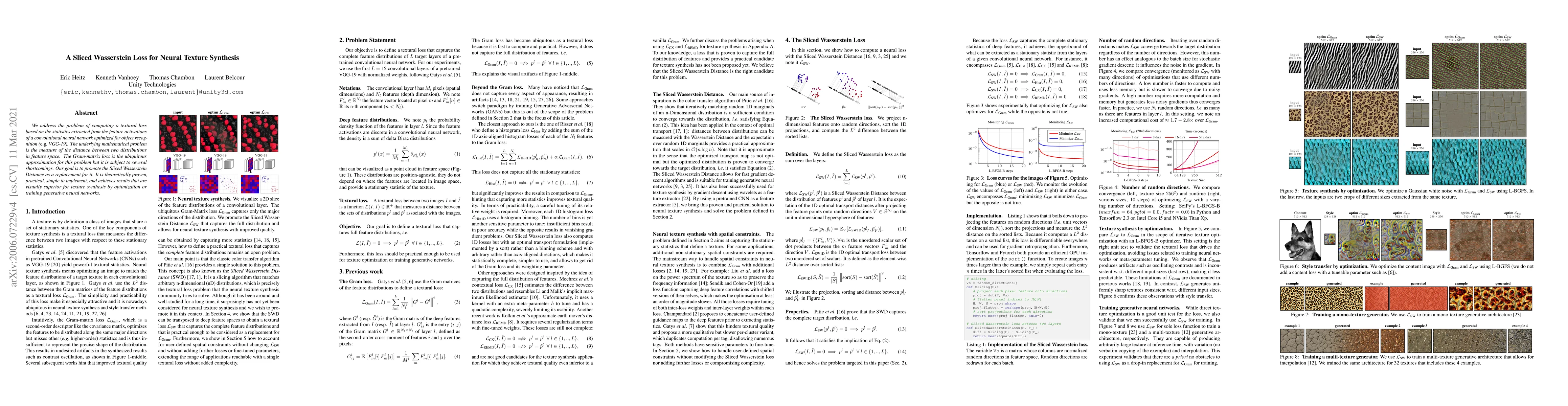 This paper proposes using the Sliced Wasserstein Distance as an improved alternative to the Gram-matrix loss for texture synthesis in neural networks. It demonstrates superior visual results in texture optimization and training generative models compared to traditional methods.