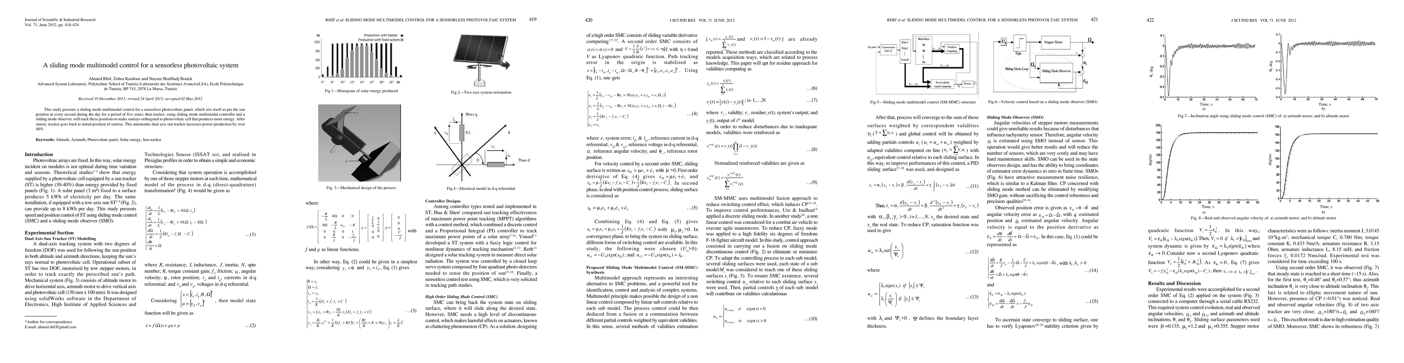 In this work we will talk about a new control test using the sliding mode control with a nonlinear sliding mode observer, which are very solicited in tracking problems, for a sensorless photovoltaic panel. In this case, the panel system will has as a set point the sun position at every second during the day for a period of five years; then the tracker, using sliding mode multimodel controller and a sliding mode observer, will track these positions to make the sunrays orthogonal to the photovoltaic cell that produces more energy. After sunset, the tracker goes back to the initial position (which of sunrise). Experimental measurements show that this autonomic dual axis Sun Tracker increases the power production by over 40%.