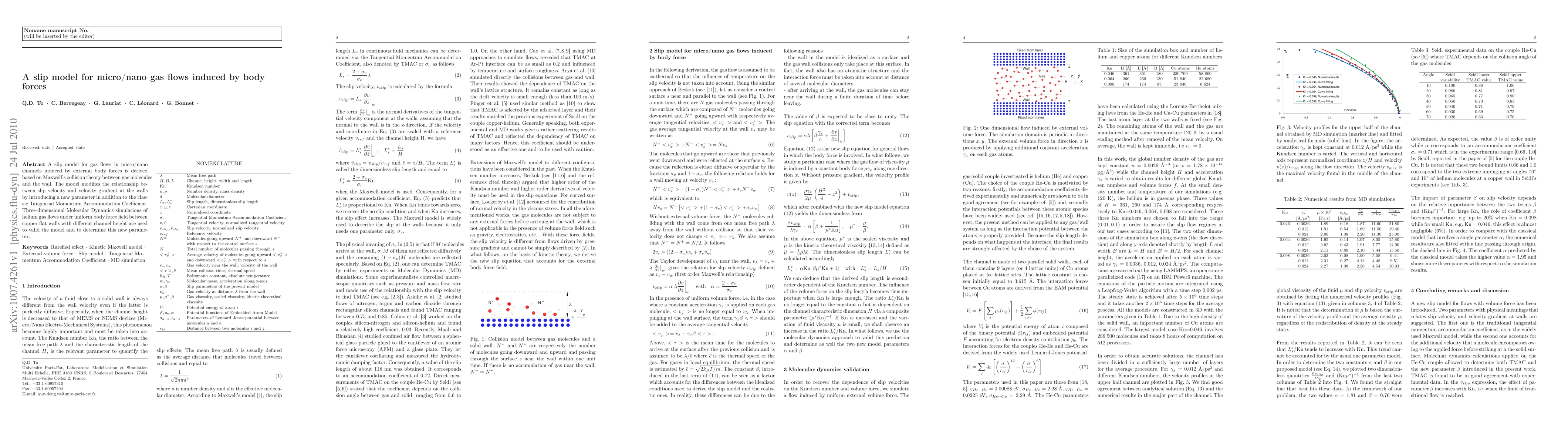 A slip model for gas flows in micro/nano-channels induced by external body forces is derived based on Maxwell's collision theory between gas molecules and the wall. The model modifies the relationship between slip velocity and velocity gradient at the walls by introducing a new parameter in addition to the classic Tangential Momentum Accommodation Coefficient. Three-dimensional Molecular Dynamics simulations of helium gas flows under uniform body force field between copper flat walls with different channel height are used to validate the model and to determine this new parameter.